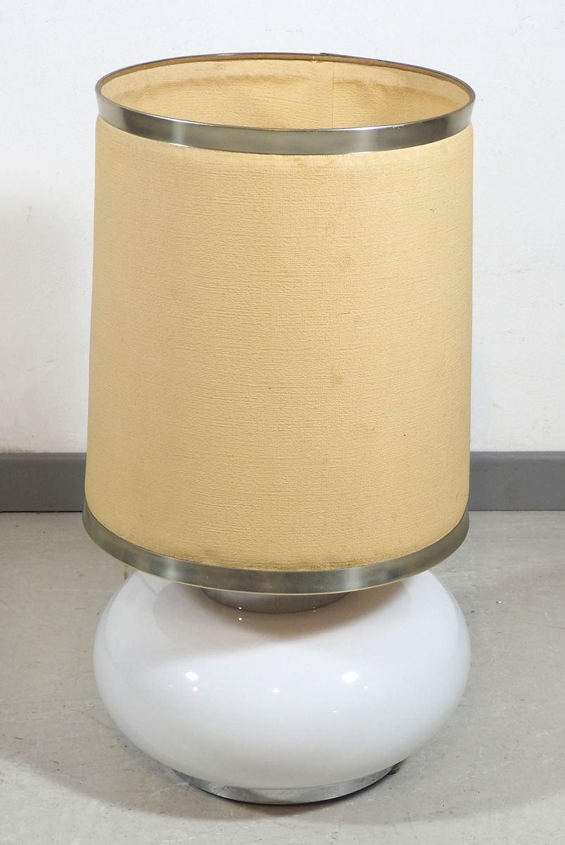 Lampada in vetro opalino con base in metallo cromato, con paralume. Anni '70....