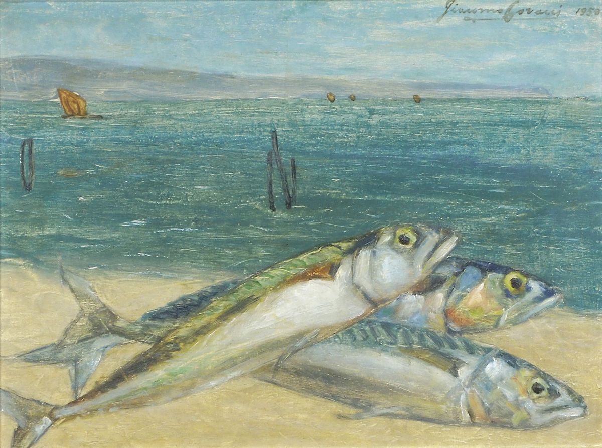 Giacomo Covacci Trieste 1882-1954 "Pesci nel paesaggio" cm. 28x38 - olio su...