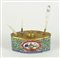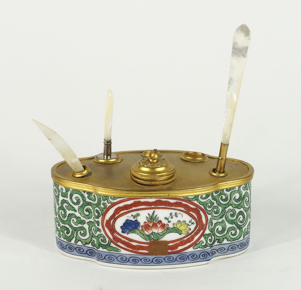Lotto 58 | Calamaio di forma ovale in ottone e porcellana policroma. Lung. cm. 17.