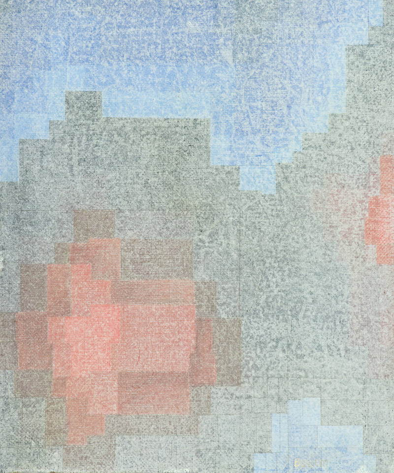 Franco Bulletti Struttura in due parti verso lo spazio azzurro, 1972 Tecnica mista su tela, cm. 60x50 Firmato in basso a destra. Sul verso: firma, data e titolo.