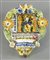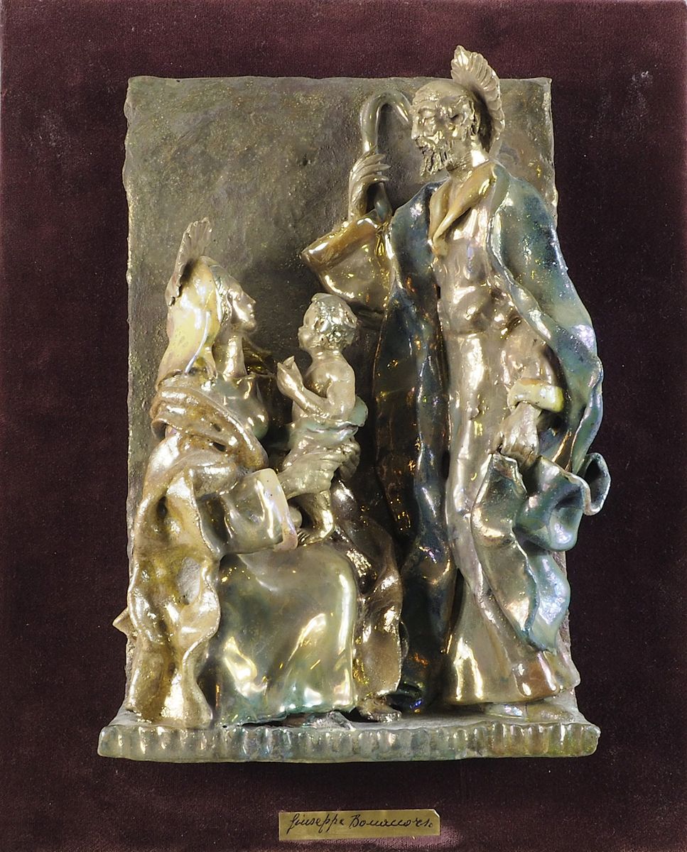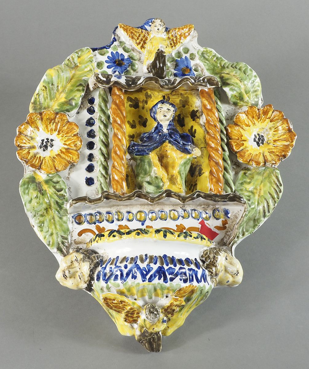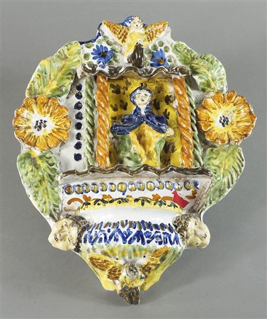 Lotto di 2 gruppi in ceramica policroma: acquasantiera e piastra. Max cm. 27x22.
