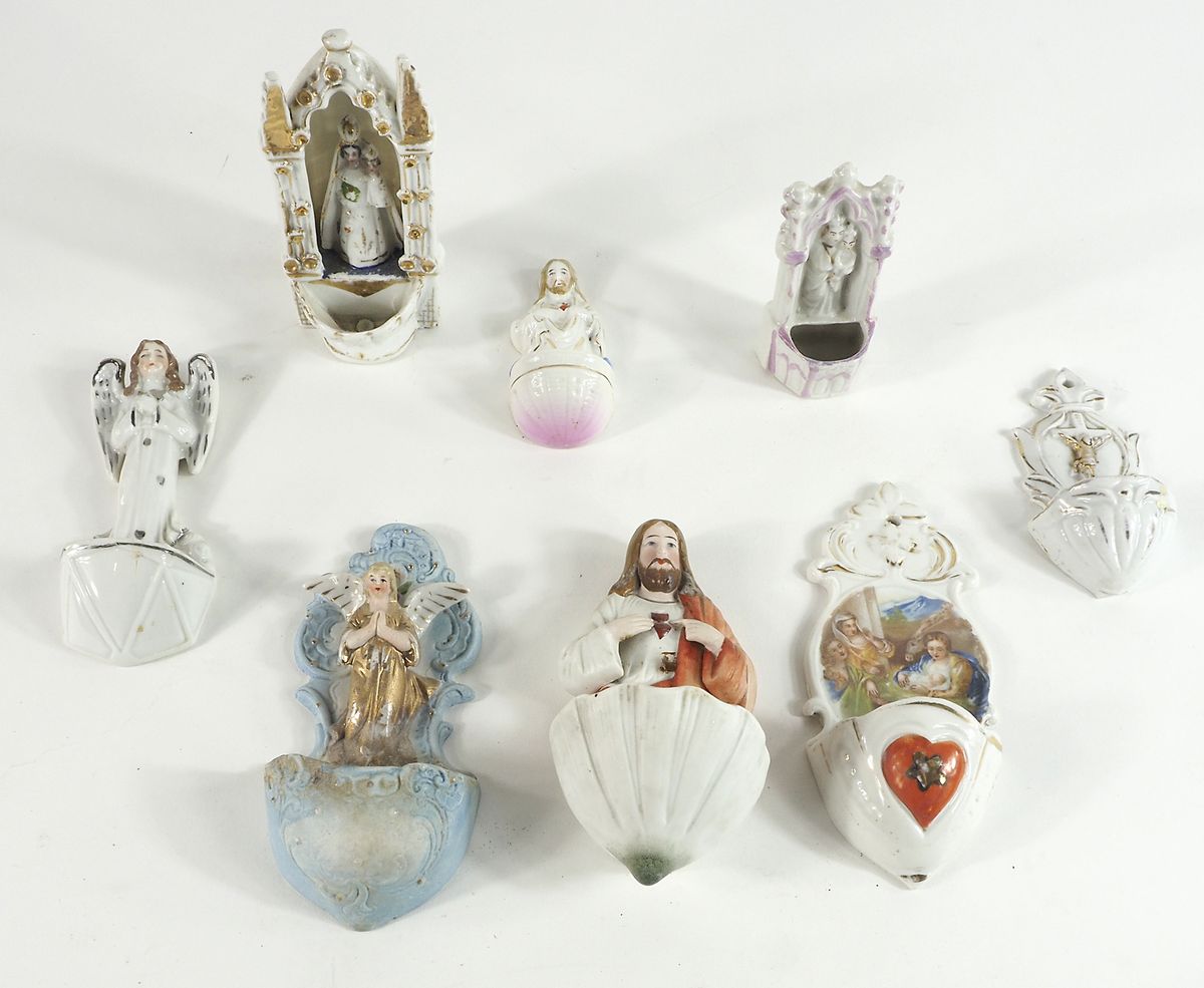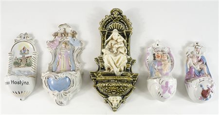 Lotto di 13 acquasantiere in ceramica e porcellana. Misure ed epoche diverse.