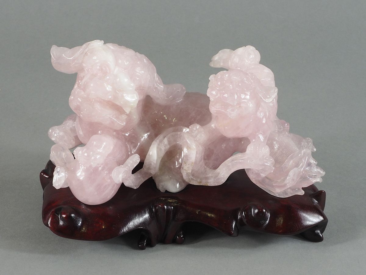 Scultura in quarzo rosa raffigurante due draghi, base in legno. Lung. cm. 20.