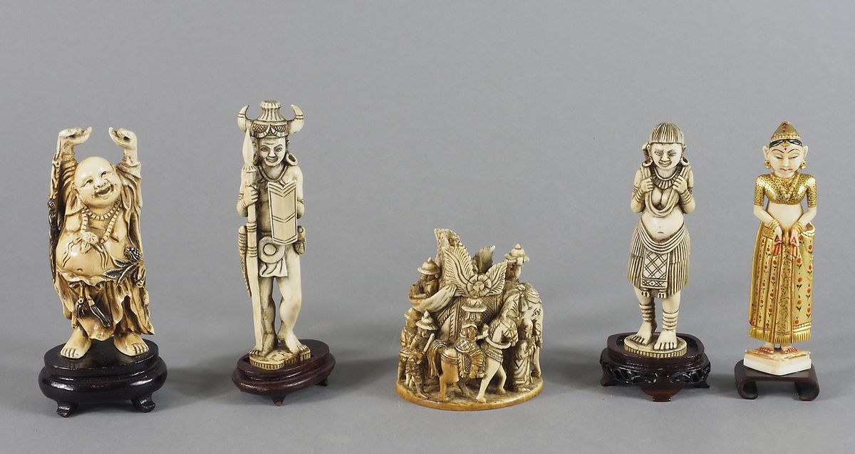 Lotto di 5 piccole sculture orientali in osso e avorio. H. max cm. 13.