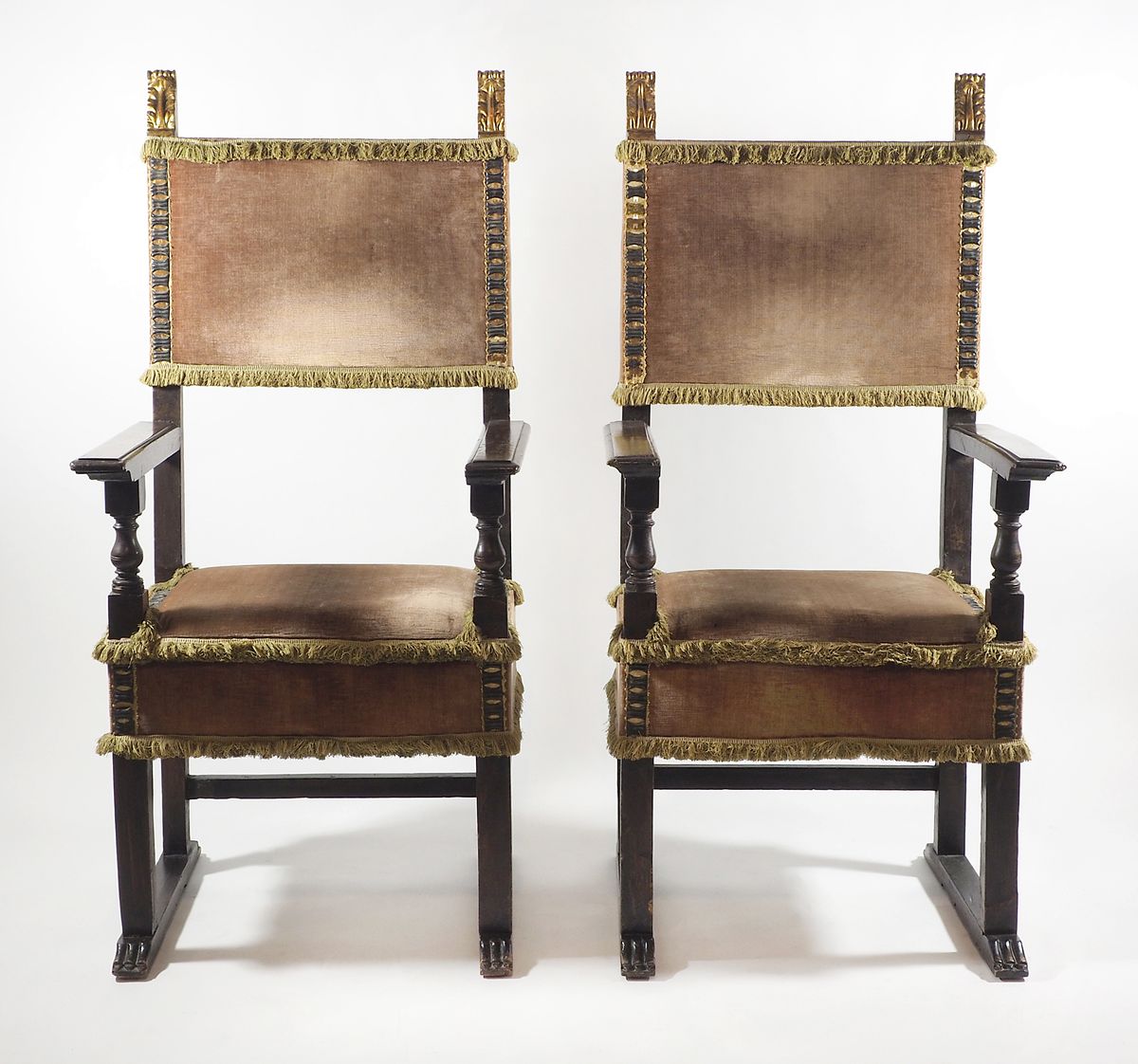 Lotto 416 | Coppia di troni con alto schienale in legno rivestiti da stoffa in velluto e...