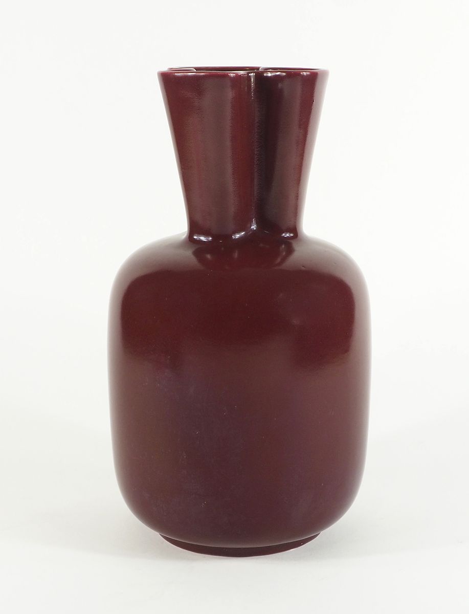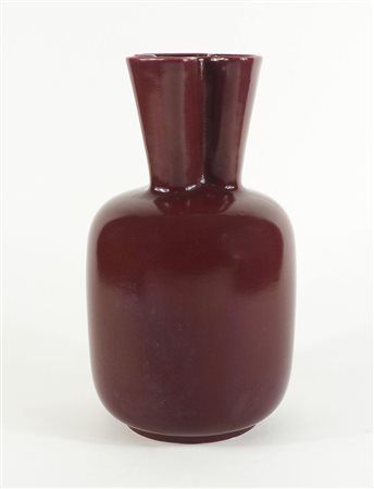 Richard-Ginori San Cristoforo: vaso in ceramica rosso scuro con collo trilobato. Disegno di G. Gariboldi 1953 circa. Marcato sotto la base. H. cm. 32,5.
