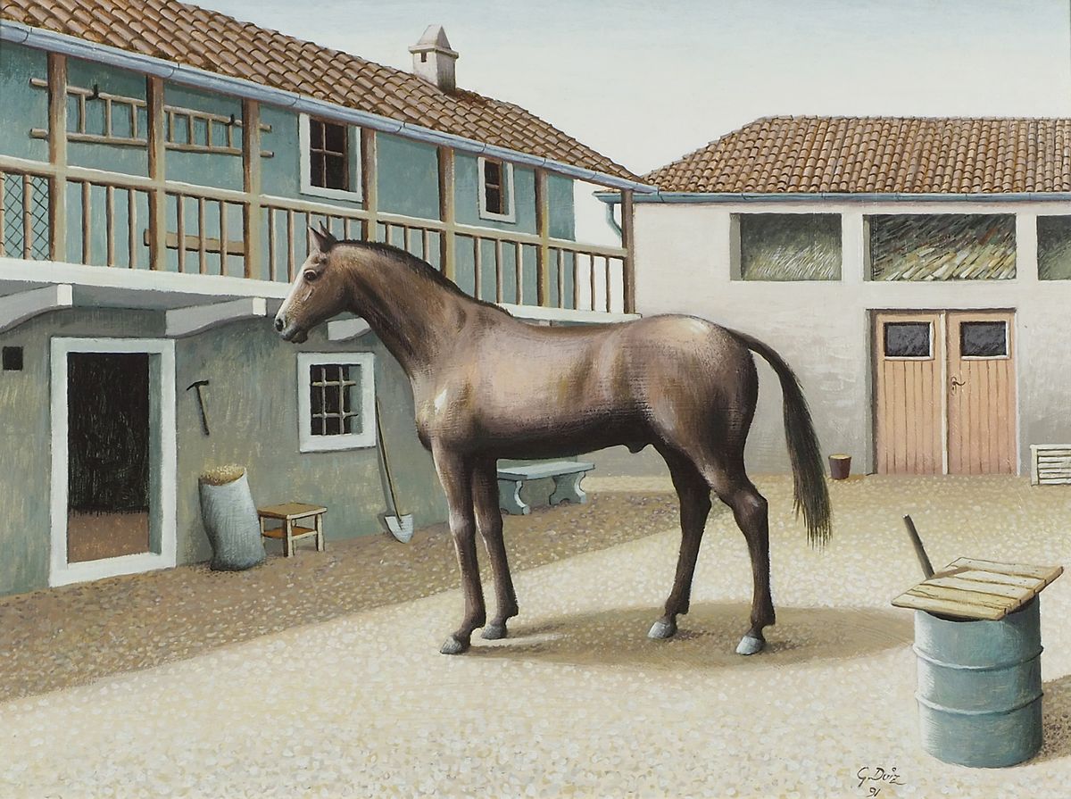 Giovanni Duiz Trieste 1923-2013 "Cavallo nel cortile" cm. 30x40 - olio su...