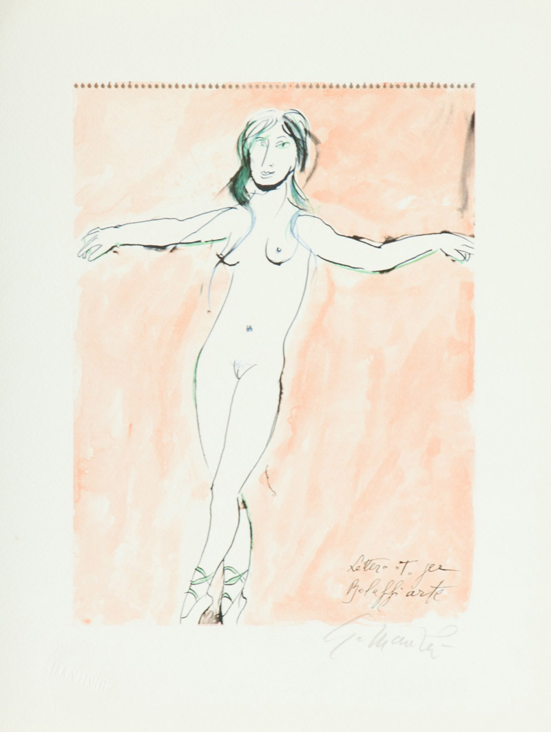 Giacomo Manzù L'alfabeto, La lettera T Riproduzione fotolitografica a cinque colori offset, cm. 30x23,5, es. 3957/5000 espressamente eseguita per la serie l'Alfabeto di Bolaffiarte in 5000 esemplari riservati al "Club dei Cinquemila". Firmato in basso a destra, timbro a secco Bolaffiarte in basso a sinistra.