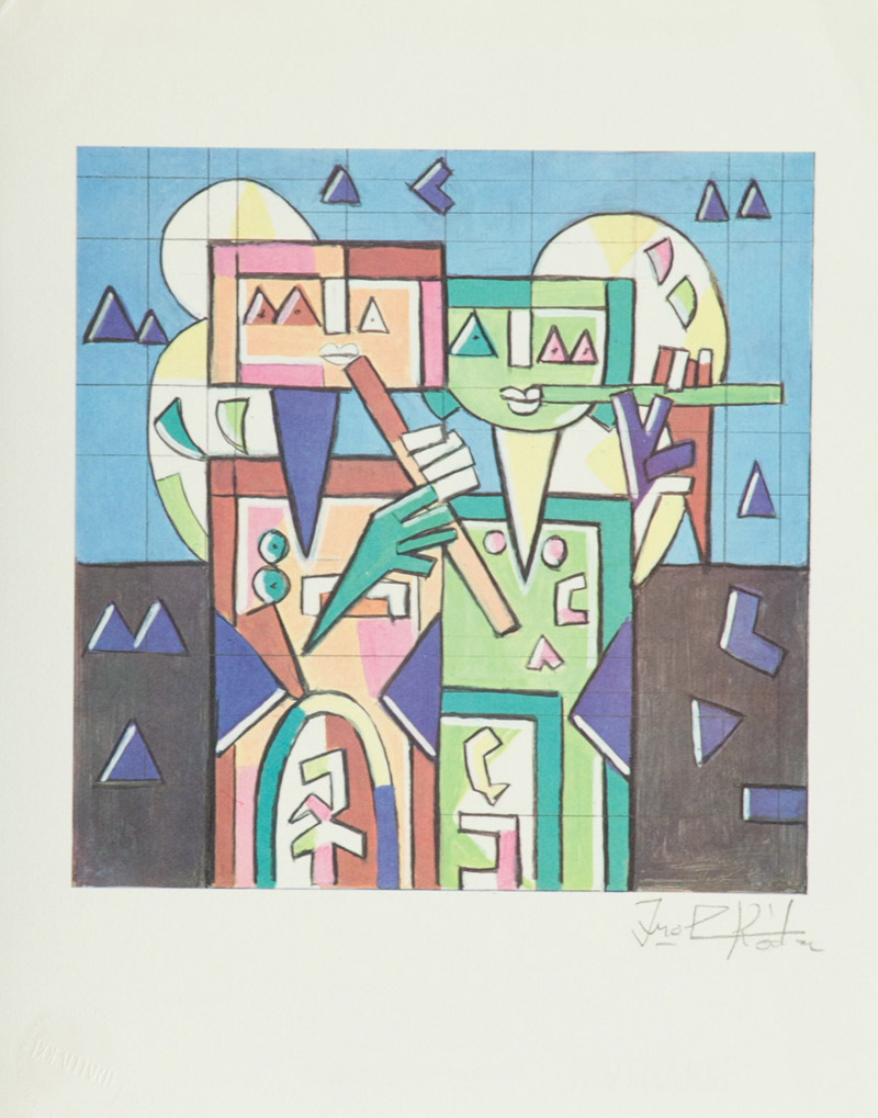 Ibrahim Shaban Likmetaj Kodra Suonatori Riproduzione fotolitografica a sei colori offset, cm. 30x23,5, es. 2403/5000 espressamente eseguita per in n° 42 di Bolaffiarte in 5000 esemplari riservati ai nuovi abbonati. Firma in basso a destra, timbro a secco Bolaffiarte in basso a sinistra.