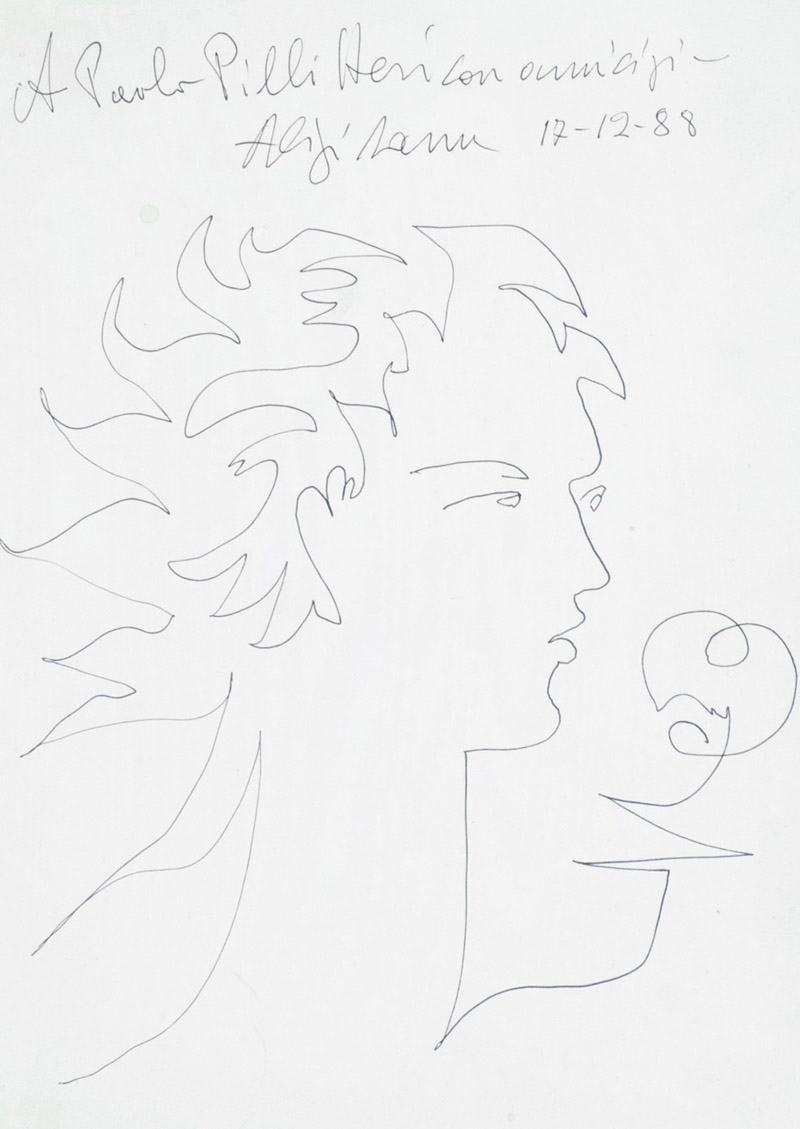 Aligi Sassu Volto, 1988 Biro su carta, cm. 28x20 Firma, data e dedica a persona in basso al centro.