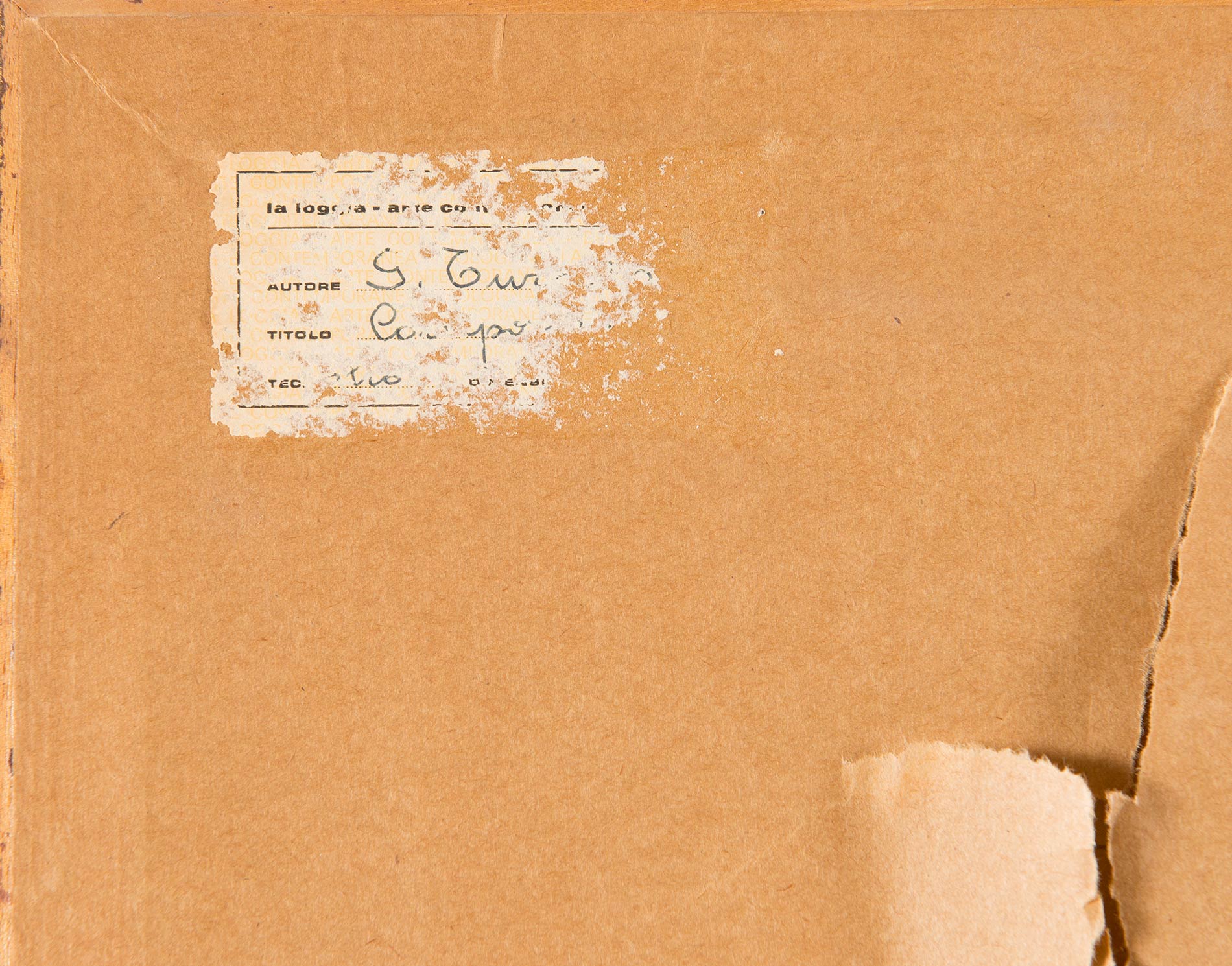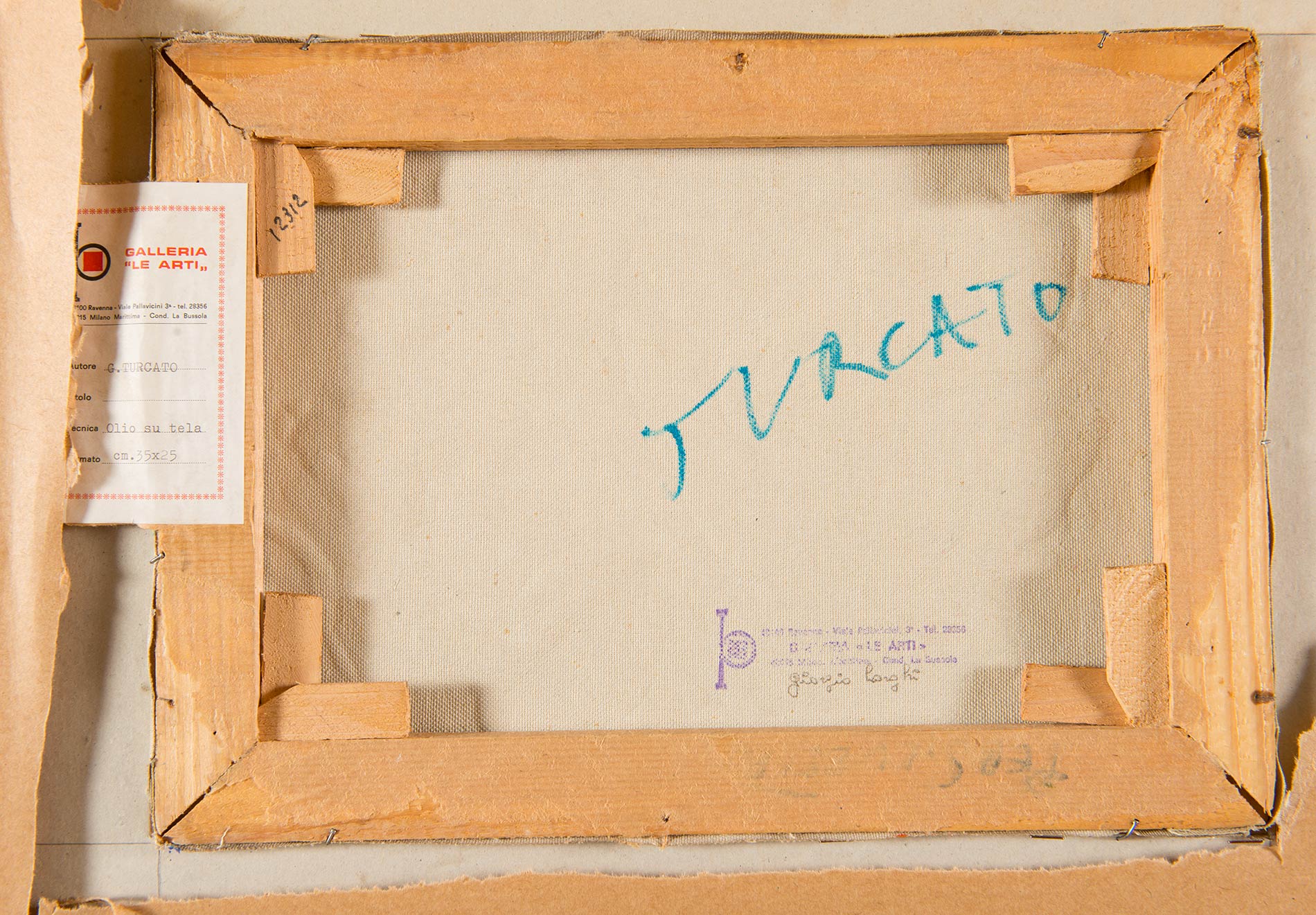 Olio su tela, firmato al retro Turcato, H cm 25x35 Al retro reca timbro ed etichetta Galleria Le Arti – Milano Marittima e firma Gorgio Longhi. Al retro reca etichetta La Loggia – Arte Contemporanea – Bologna. Provenienza: Collezione Privata – Bologna.