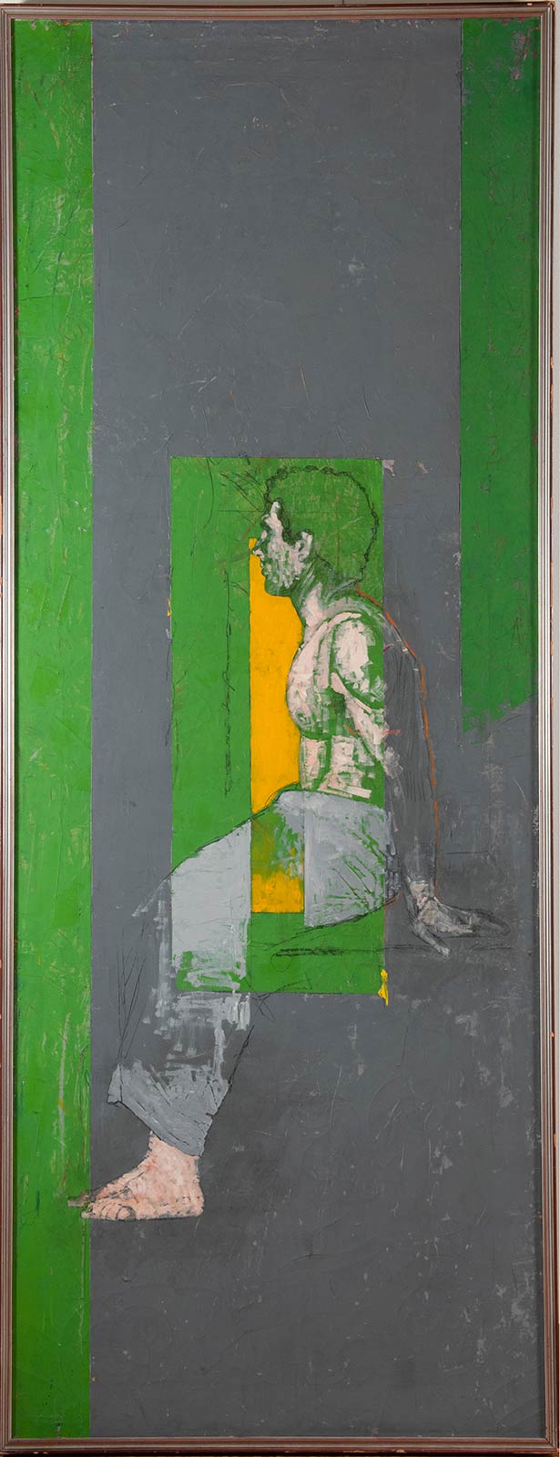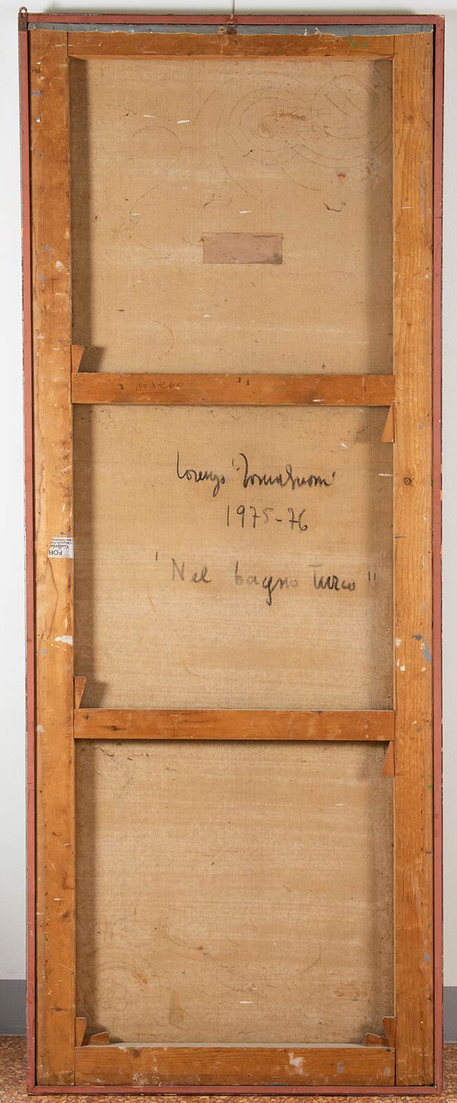 Olio su tela, firmato, datato e titolato al retro ‘Lorenzo Tornabuoni/1975-76/Nel bagno turco’, al retro reca dedica dell’autore in data 1979, H cm 260x100Al retro reca etichetta parzialmente leggibile della Galleria Forni – Bologna. Opera accompagnata da certificato di autenticità su fotografia del gallerista Tiziano Forni con numero 3135 e firma dell’artista in data 1985.