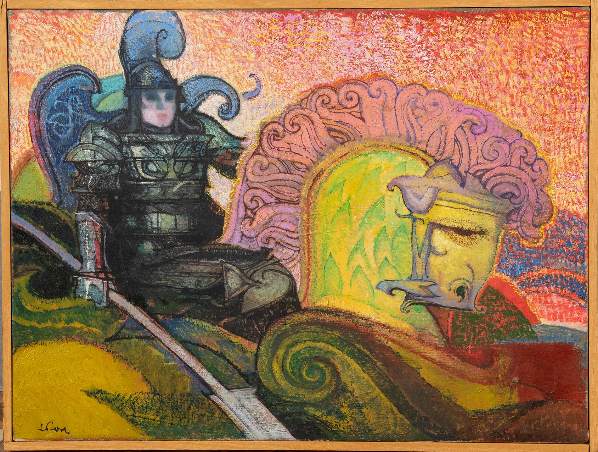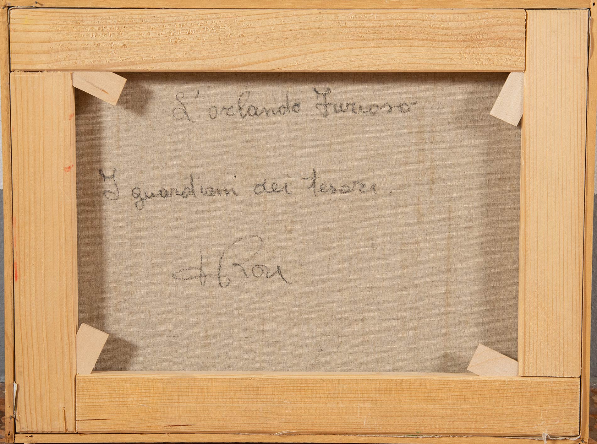 Olio su tela, firmato in basso a sinistra De Rosa, al retro titolo e firma ‘L’Orlando Furioso/I guardiani dei tesori/De Rosa’, H cm 30x40 Opera accompagnata da certificato di autenticità su fotografia a firma De Rosa
