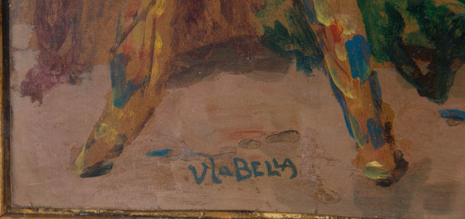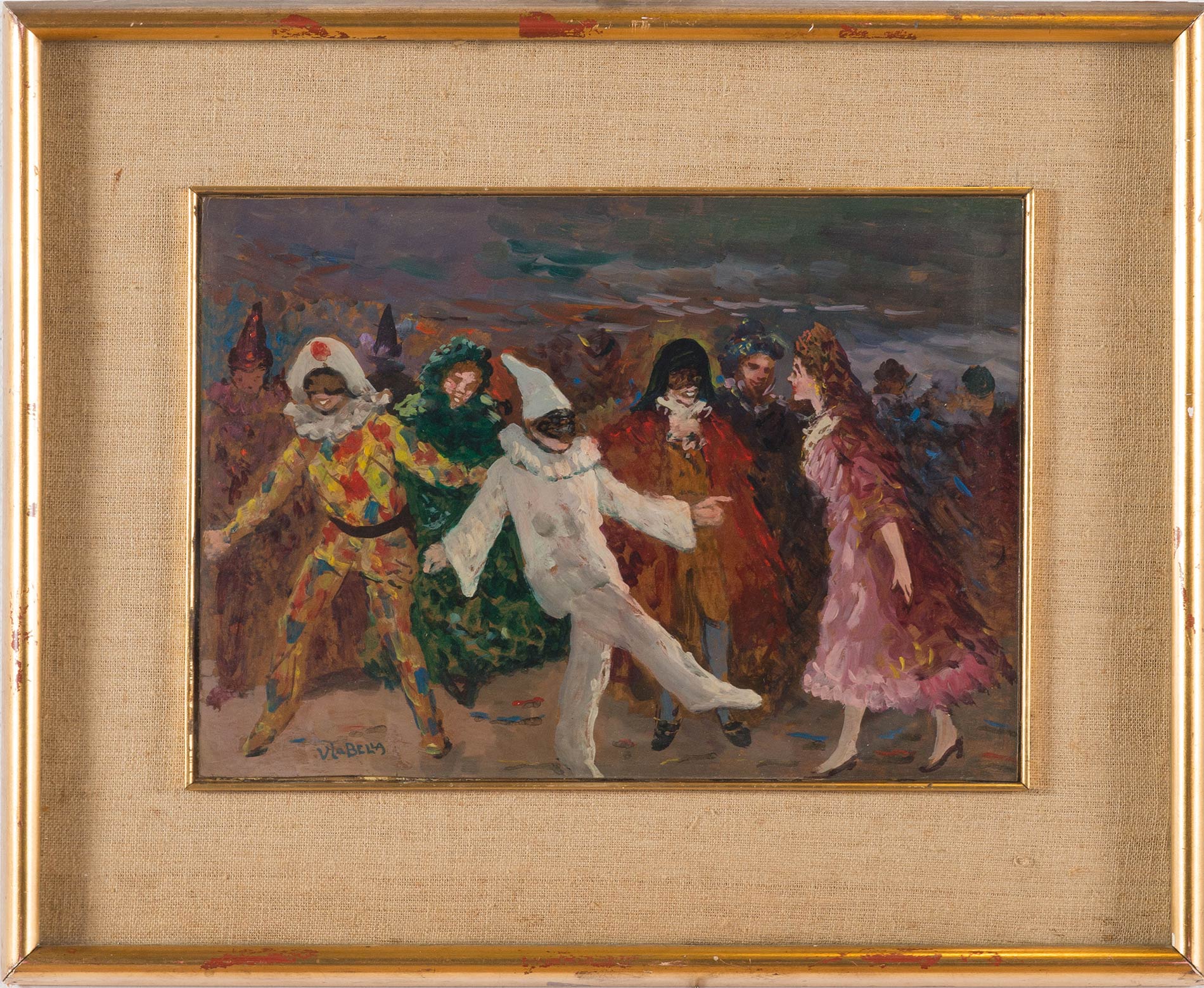 Olio su cartone, firmato in basso a sinistra V. La Bella, al retro tiolo ‘Maschere', H cm 26x36