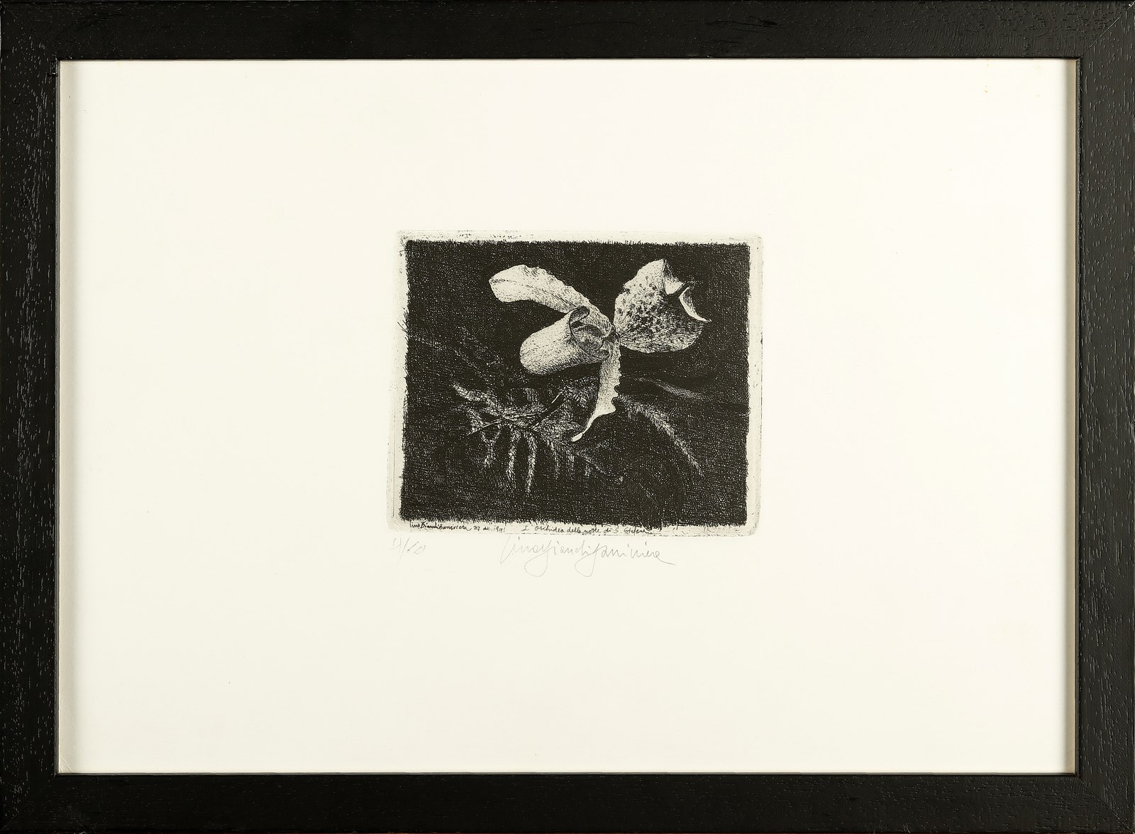 BIANCHI BARRIVIERA LINO (1906 - 1985) L'orchidea della notte di S. Stefano. 1991. Acquaforte. Cm 34,00 x 24,00. 4/10. Tiratura e firma a matita in basso. Firma, titolo e anno in lastra. Dimensione lastra: 10x12 cm. Cornice presente