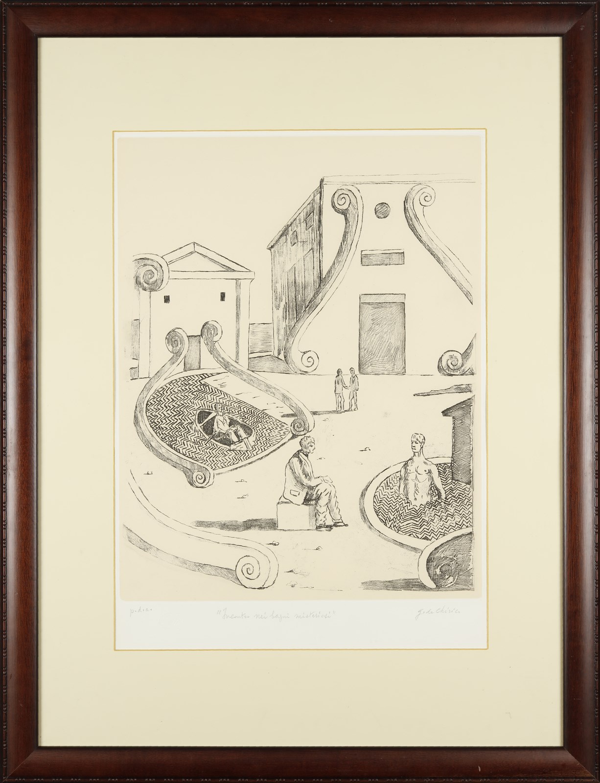 DE CHIRICO GIORGIO (1888 - 1978) Incontro nei bagni misteriosi. Acquaforte. Cm 50,00 x 70,00. P.d.a. Tiratura, titolo e firma in basso a matita. Timbro a secco Giorgio De Chirico in basso a sinistra. Dimensione lastra: 49x38 cm. Edizione totale: 75 esemplari numerati da 1 a 75. 25 esemplari numerati da I a XXV + 15 p.d.a. Pubblicazione: Giorgio De Chirico catalogo dell'opera grafica 1969 - 1977, Edizioni Bora, pag. 33. Cornice presente