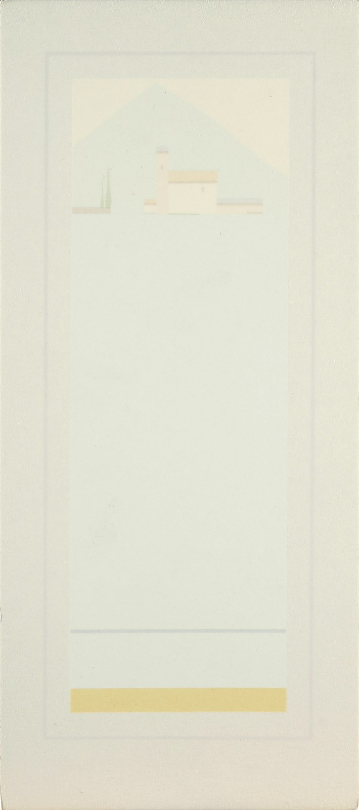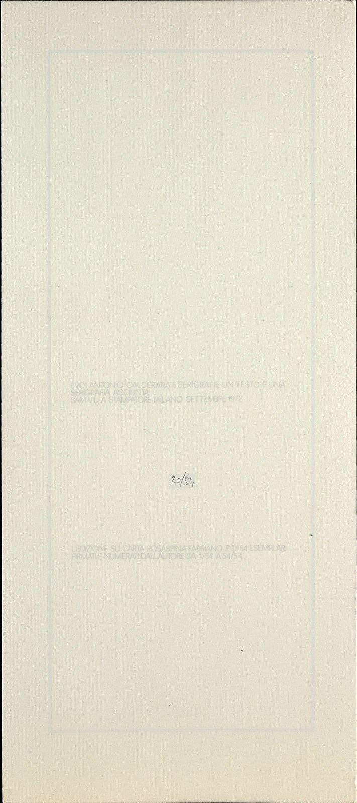 CALDERARA ANTONIO (1903 - 1978) Cartella composta da n.6+1 fogli. La fine da significato al principio. 1972. Litografia. Cm 17,00 x 35,00. 20/54. Ogni foglio è firmato, numerato e datato al retro a matita. Sam Villa stampatore, Milano 1972. Carta Rosaspina Fabriano. Edizione totale: 54 esemplari numerati da 1/54 a 54/54. Confezione originale.