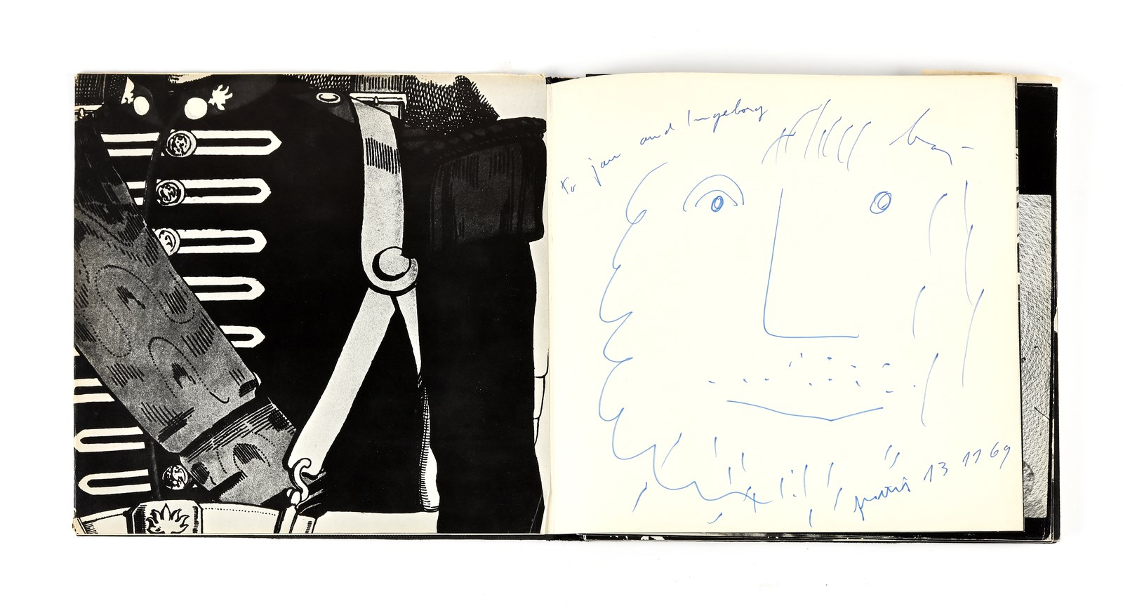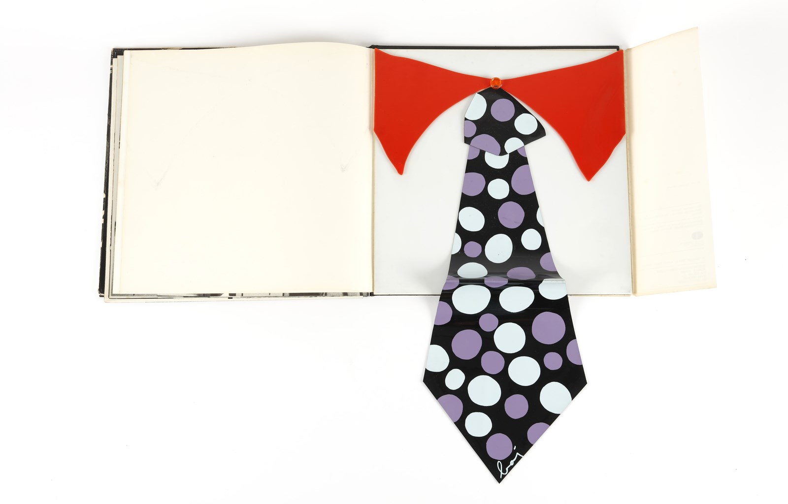 BAJ ENRICO (1924 - 2003) Baj. 1969. Disegno, multiplo e monografia. Cm 31,00 x 31,00. L'opera è composta dalla monografia di Jan van der Marck, "Baj" e dal multiplo in plastica "Cravatta" prodotto in 3000 esemplari non firmati e non numerati, cm 56x30, destinati, in parte, a corredare alcune copie della pubblicazione, in edizione speciale. Achille Mauri Editore, Milano. In prima pagina presenta un disegno autografo dell'artista e la dedica all'autore Jan Van der Marck e alla moglie Ingeborg. Si ringrazia Roberta Cerini Baj per l'aiuto prestato per la compilazione della scheda e la conferma dell'autenticità dell'opera.