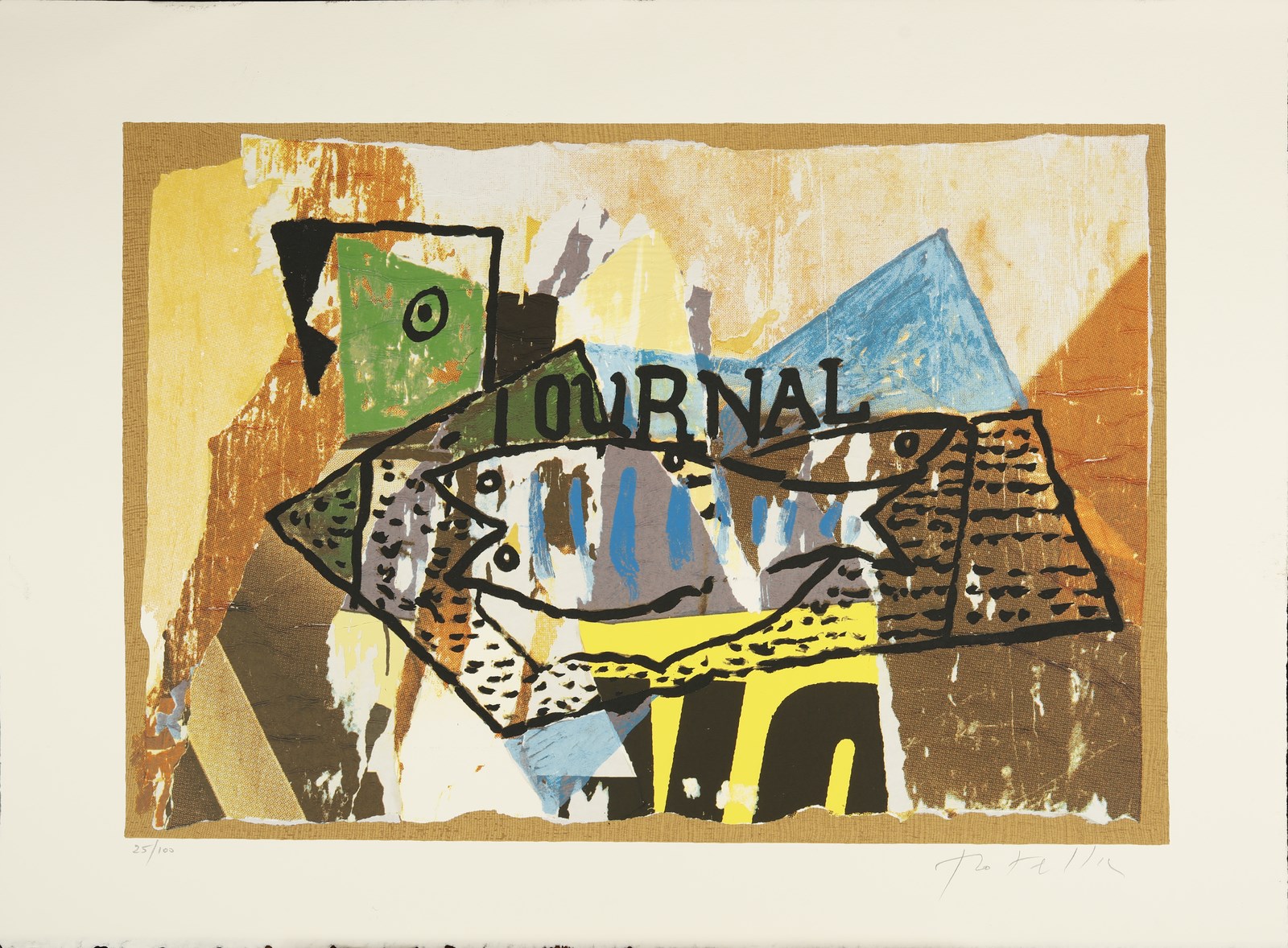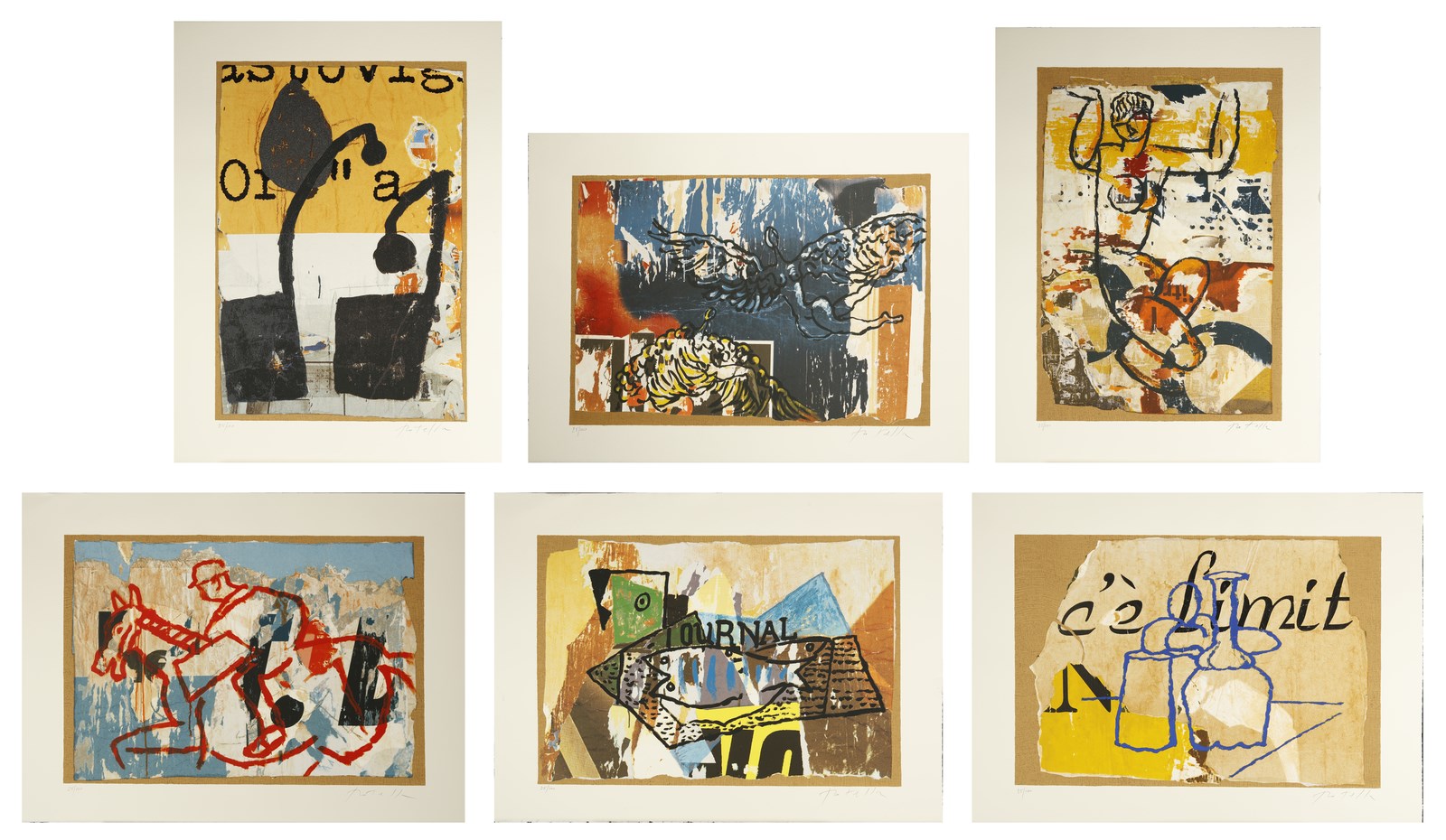 MIMMO ROTELLA Cartella composta da n.6 fogli. Dalla serie I Maestri del 900: Primo Futurismo, L'angelo cattivo, Mirò in nero, Il giornale di Picasso, Morandiana, Modigliani.