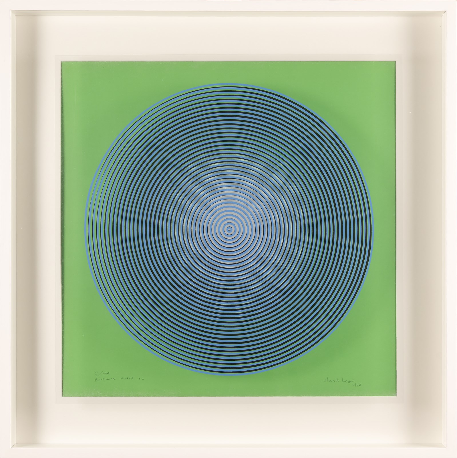 BIASI ALBERTO (n. 1937) Progetto S2, dinamica visiva in azzurro e nero su verde sfumato bianco. 1970. Doppia serigrafia su pvc trasparente e cartoncino.. Cm 47,50 x 47,50. 21/100. Tiratura, titolo, firma e anno a matita in basso. Giuseppe Strano Editore, Padova. . Cornice presente