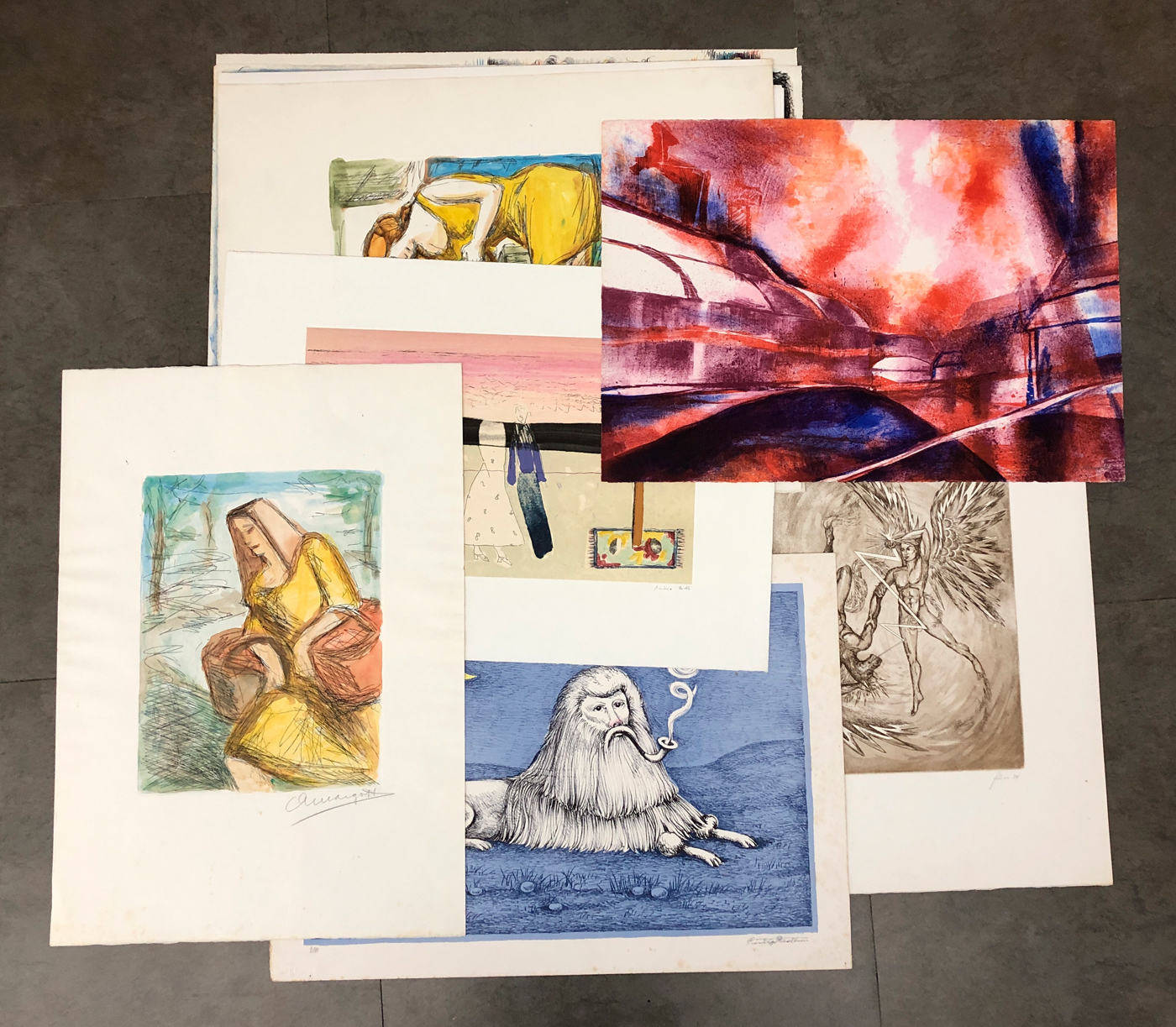 Lotto unico composto da 13 opere grafiche, ciascuna recante firma e numerazione a matita al fronte ( 2 Andrea Granchi, Michelangelo Tomarchio Levi, Gino Guida, Popple, Tino Pelloni, 2 opere a firma indecifrata e prive di numerazione, Andrea Melli, 3 opere a firma indecifrata e Fernando Farulli priva di numerazione)