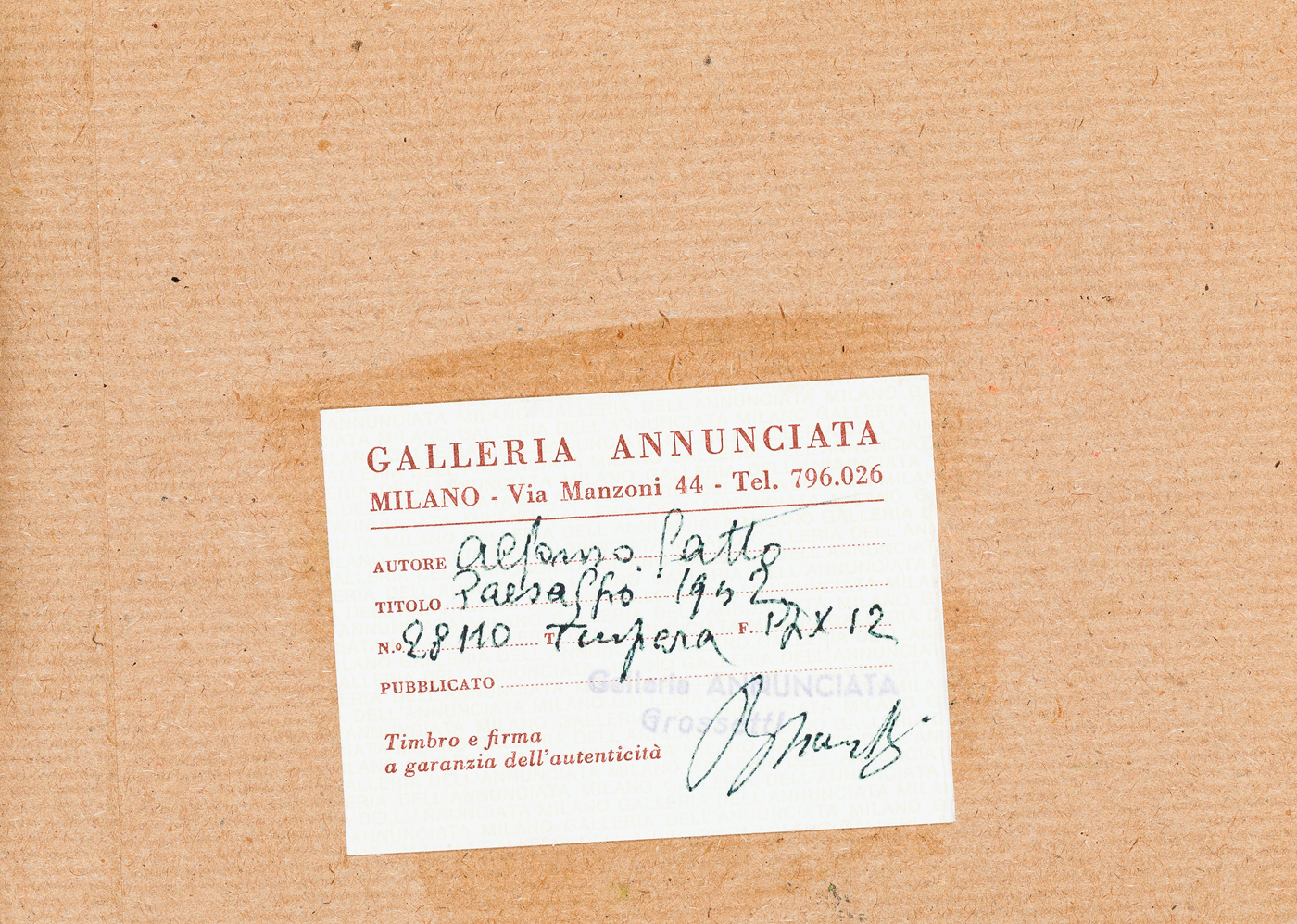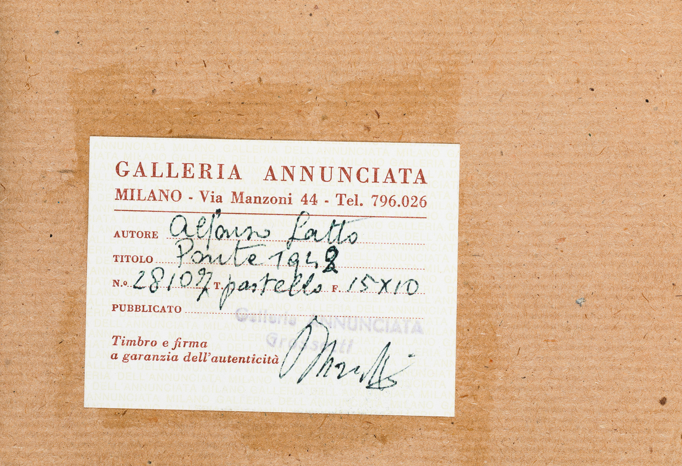 Etichetta della Galleria Annunciata (MI) al retro
