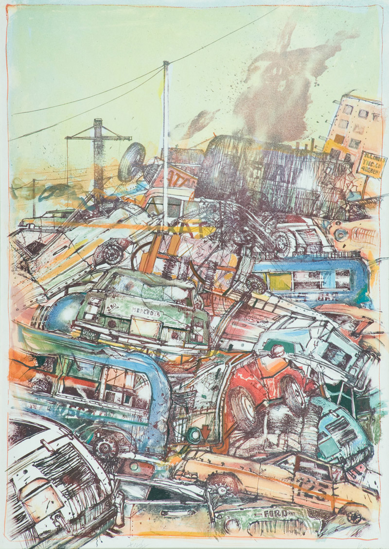 Pier Luigi Romani Sfasciacarrozze Litografia su carta, cm. 70x50, es. XIV/XX Firma in basso a destra, tiratura in basso a sinistra.