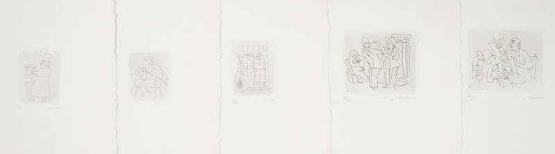 Mino Maccari Senza titolo Cartella contenente sette incisioni all'acquaforte, misure varie, su carta di cm. 35,5x25, es. 55/65 Tutte le incisioni sono firmate e numerate. La cartella è stata eseguita e stampata da Mino Maccari ed edita da Imex Lane S.p.a. ed è corredata da uno scritto di Carlo L. Ragghianti.