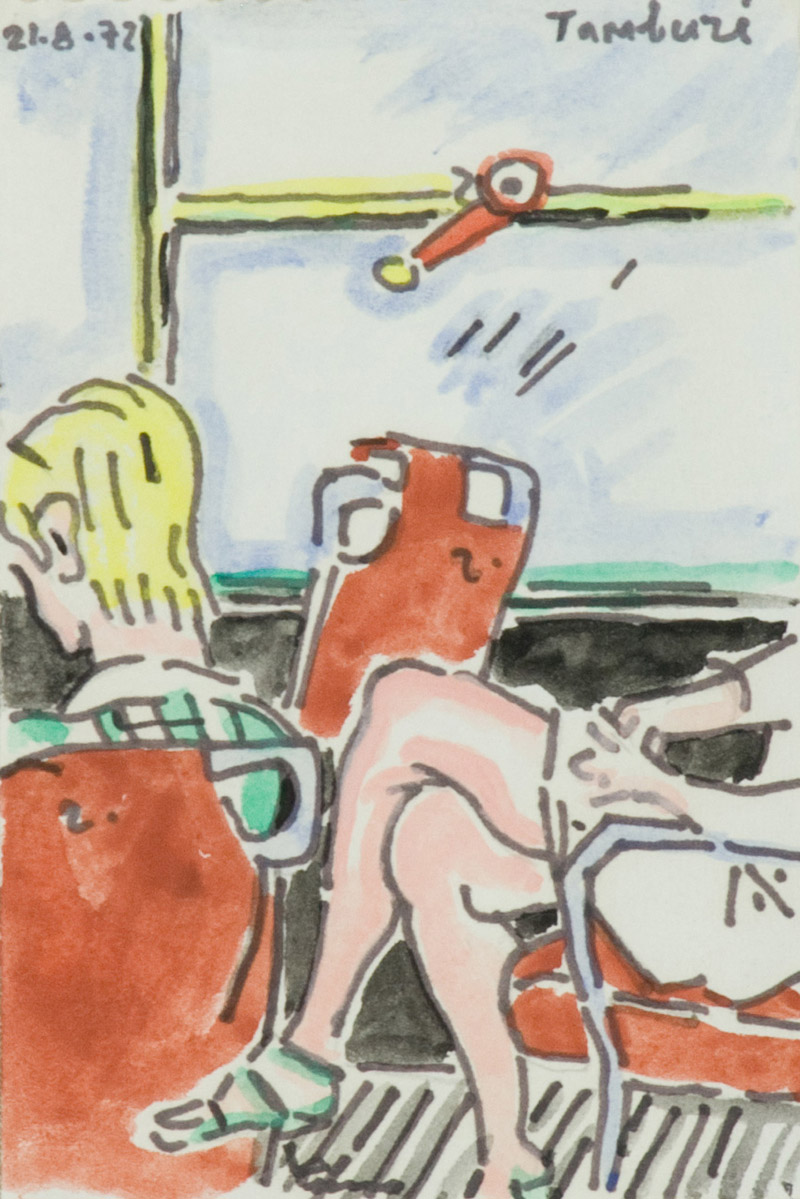 Orfeo Tamburi Sul tram, 1972 Pennarelli su carta intelata, cm. 13x8,5 Firma in alto a destra, data in alto a sinistra. Autentica dell'Artista su foto.