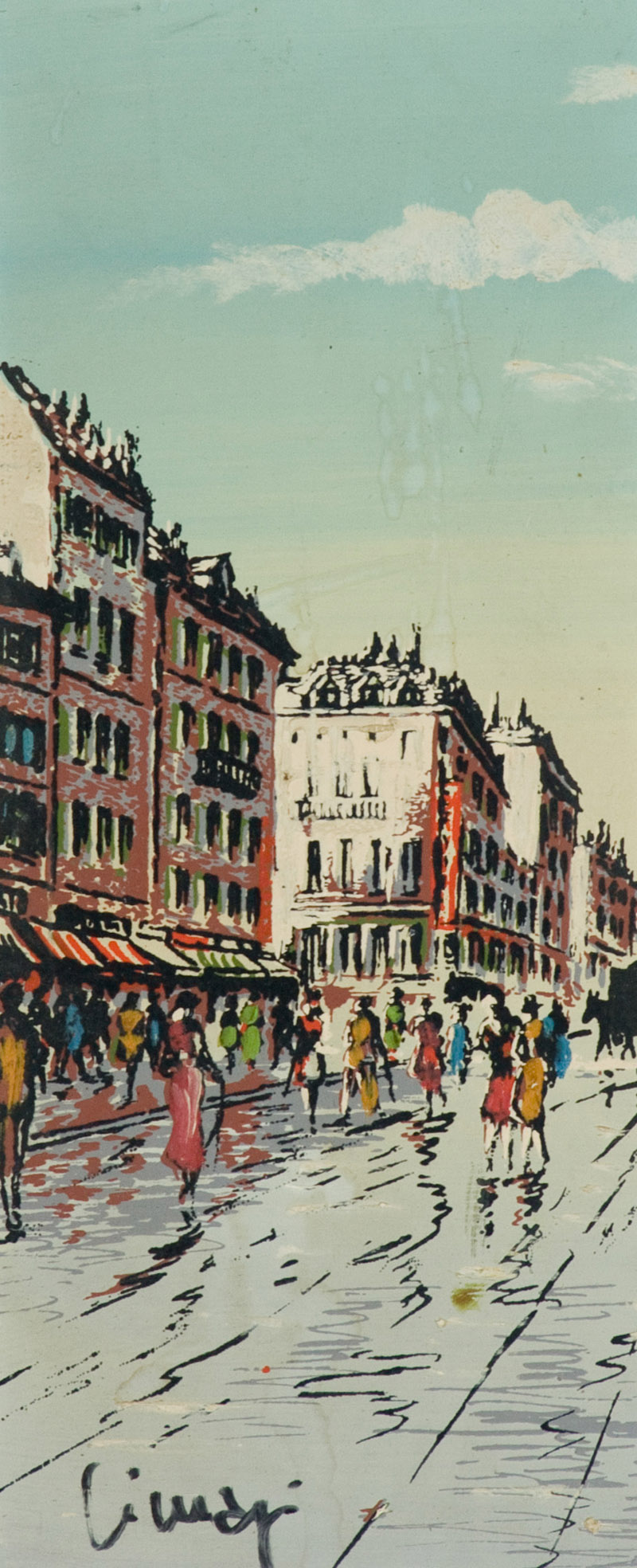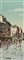 Anonimo Scorcio di città Tecnica mista su cartone, cm. 30x13 La carta presenta lievi ingiallimenti. Firma illeggibile in basso a sinistra.