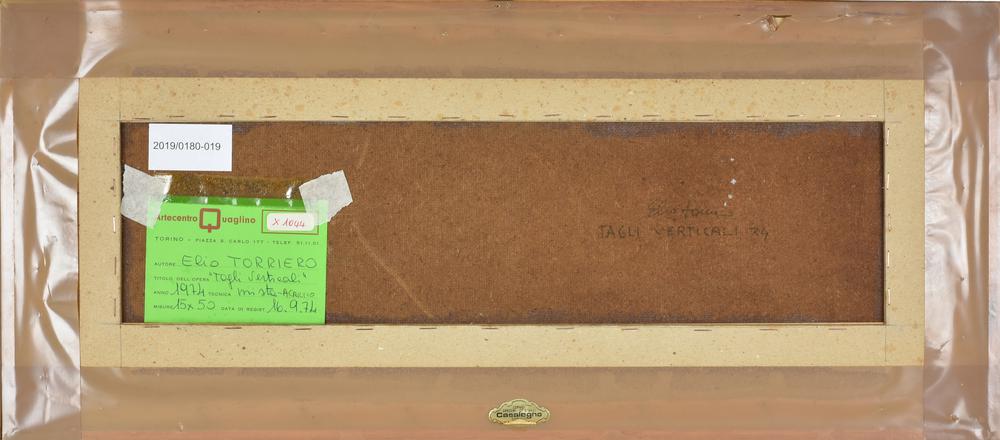 Elio Torriero TAGLI VERTICALI tecnica mista su masonite, cm 15x50 sul fronte:...