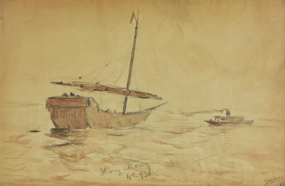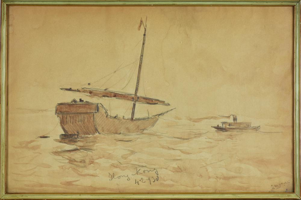 Filiberto Minozzi VEDUTA DEL PORTO DI HONK KONG matita e guache su carta, cm...