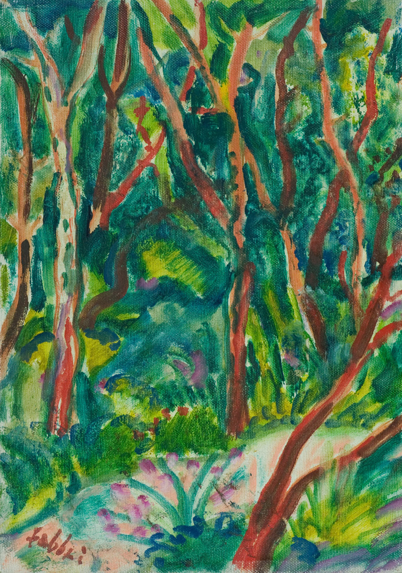 Alfredo Fabbri Bosco, 1977 Olio su tela, cm. 35x25 La tela presenta lieve usura sul lato destro. Firmato in basso a sinistra. Sul verso: firma, data e titolo.