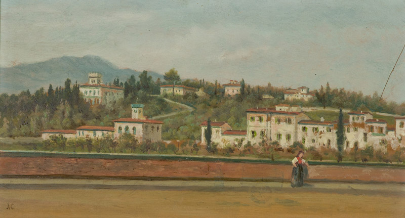 Anonimo Paesaggio con figura Olio su tavola, cm. 19x34 Sigla "A.C." in basso a sinistra.