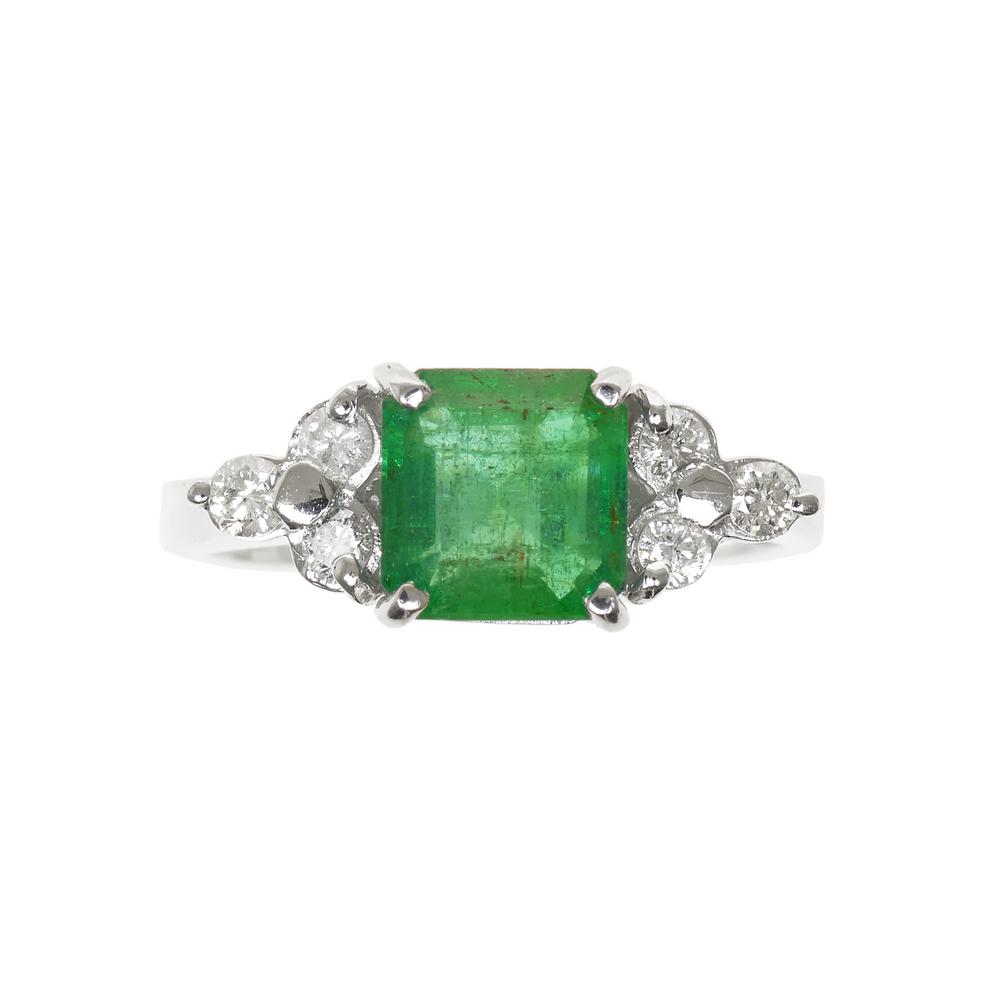 al centro uno smeraldo di forma quadrata ad angoli tronchi di ct 2.40 circa, ai lati diamanti di forma rotonda a brillante per ct 0.18 circa, punzone 750