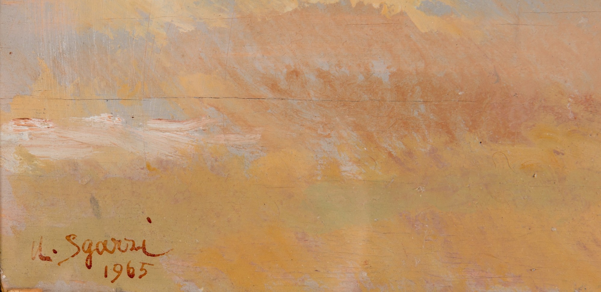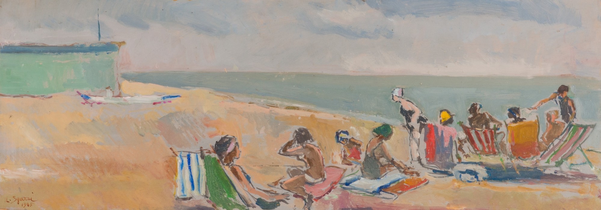 Lotto 18 | UMBERTO SGARZI (Bologna 1921 - 2017). “Spiaggia”, 1965. Olio su tavola. Cm...