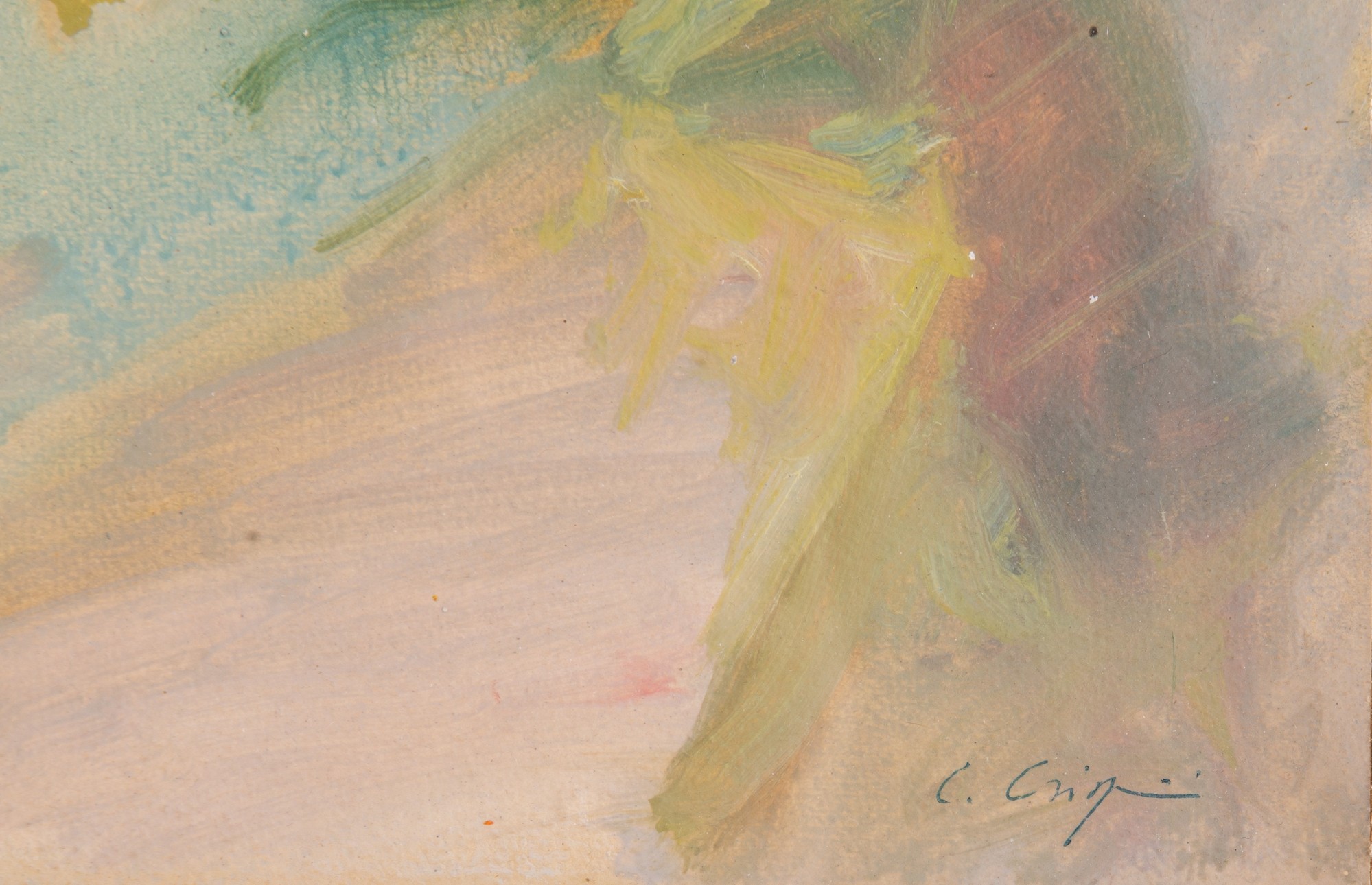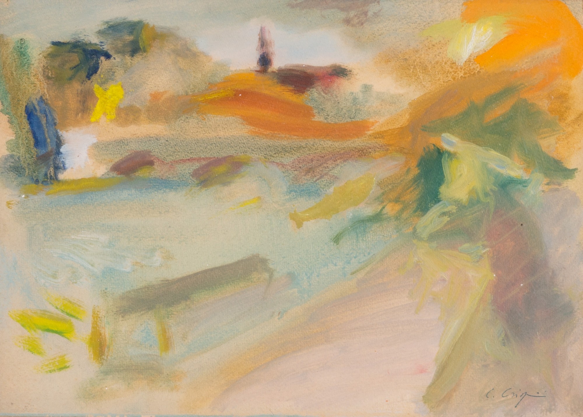 CARLO CRISPINI (Pontelagoscuro 1902 - Bologna 1982). “Paesaggio”. Olio e tecnica mista su cartone. Cm 24x34,5. Opera firmata in basso a destra “C. Crispini”.