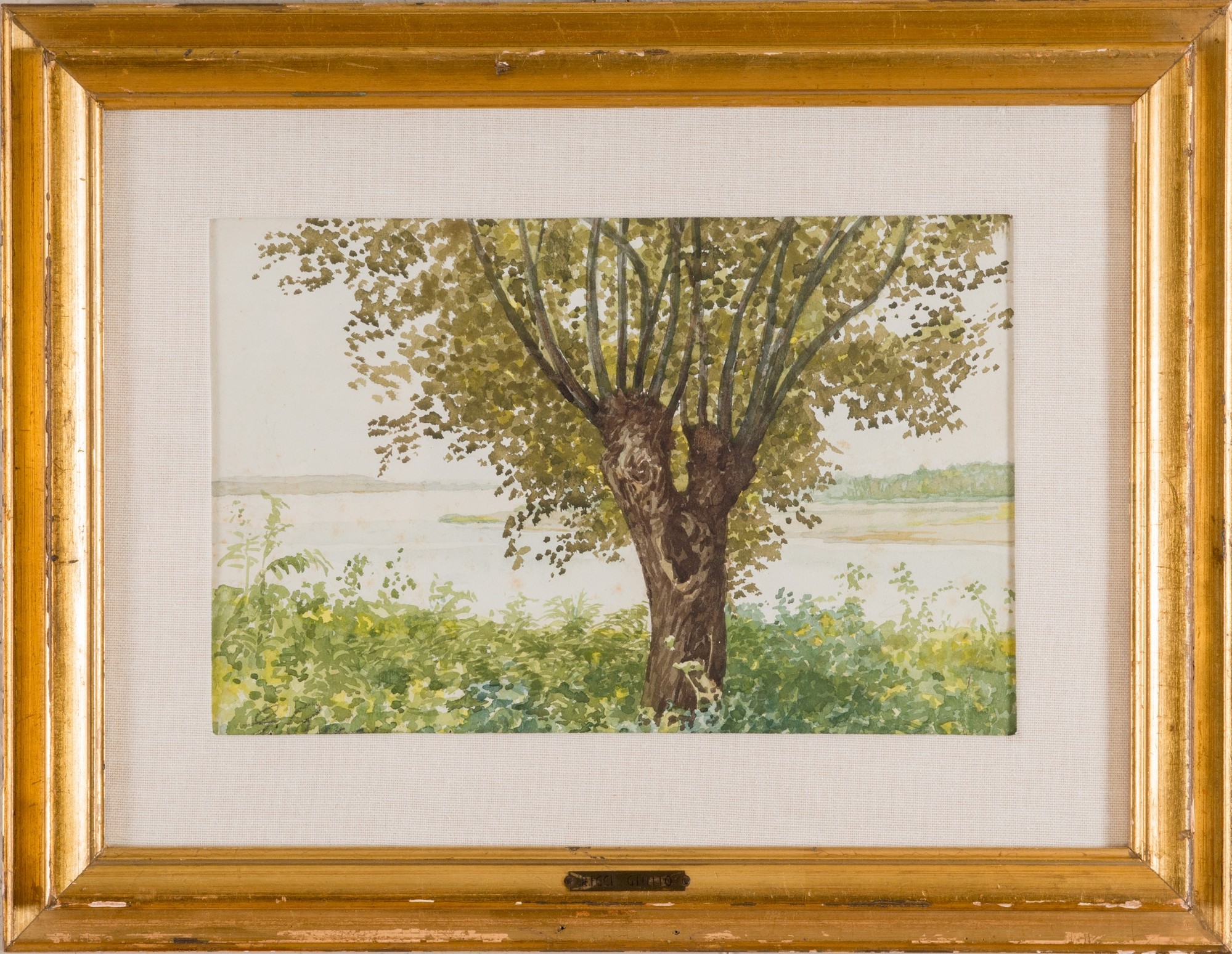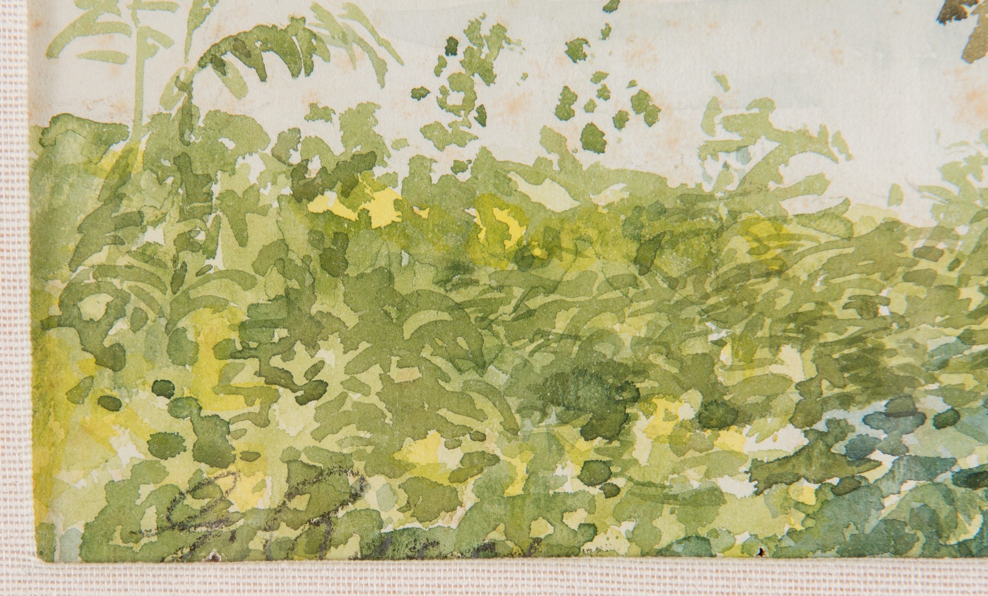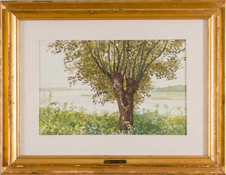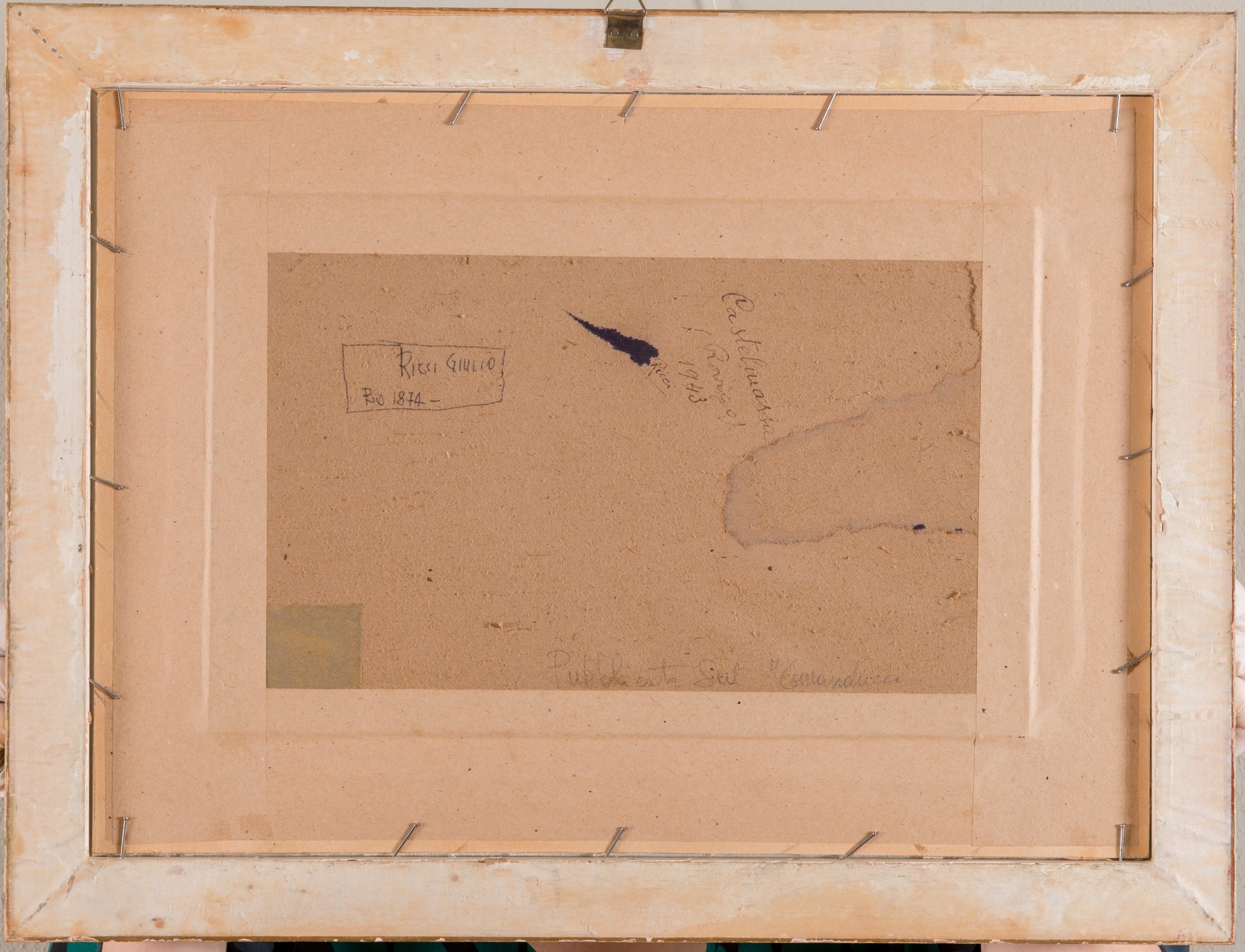 GIULIO RICCI (1900). “Castelmassa (Rovigo), 1943”. Acquerello su cartone. Cm 20x31. Opera firmata in basso a sinistra “G.Ricci”. L’opera reca titolo, data e firma al retro “Castelmassa Rovigo 1943 Ricci”.