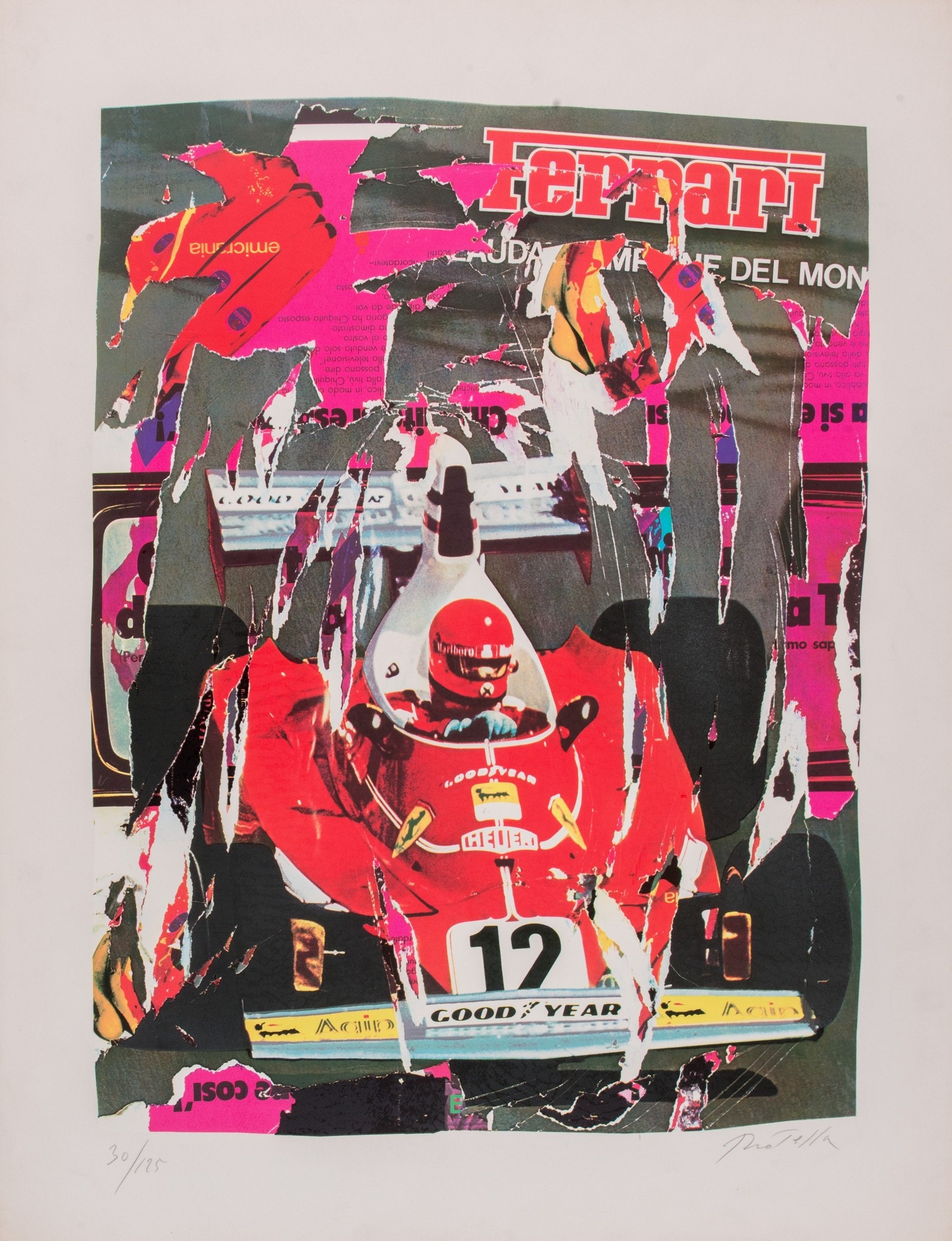 MIMMO ROTELLA (Catanzaro 1918 – Milano 2006). “Ferrari”. Litografia a colori su carta. Foglio: Cm 89,7x69,4. Opera firmata in basso destra “Rotella”. Reca numero di tiratura in basso a sinistra 30/125.