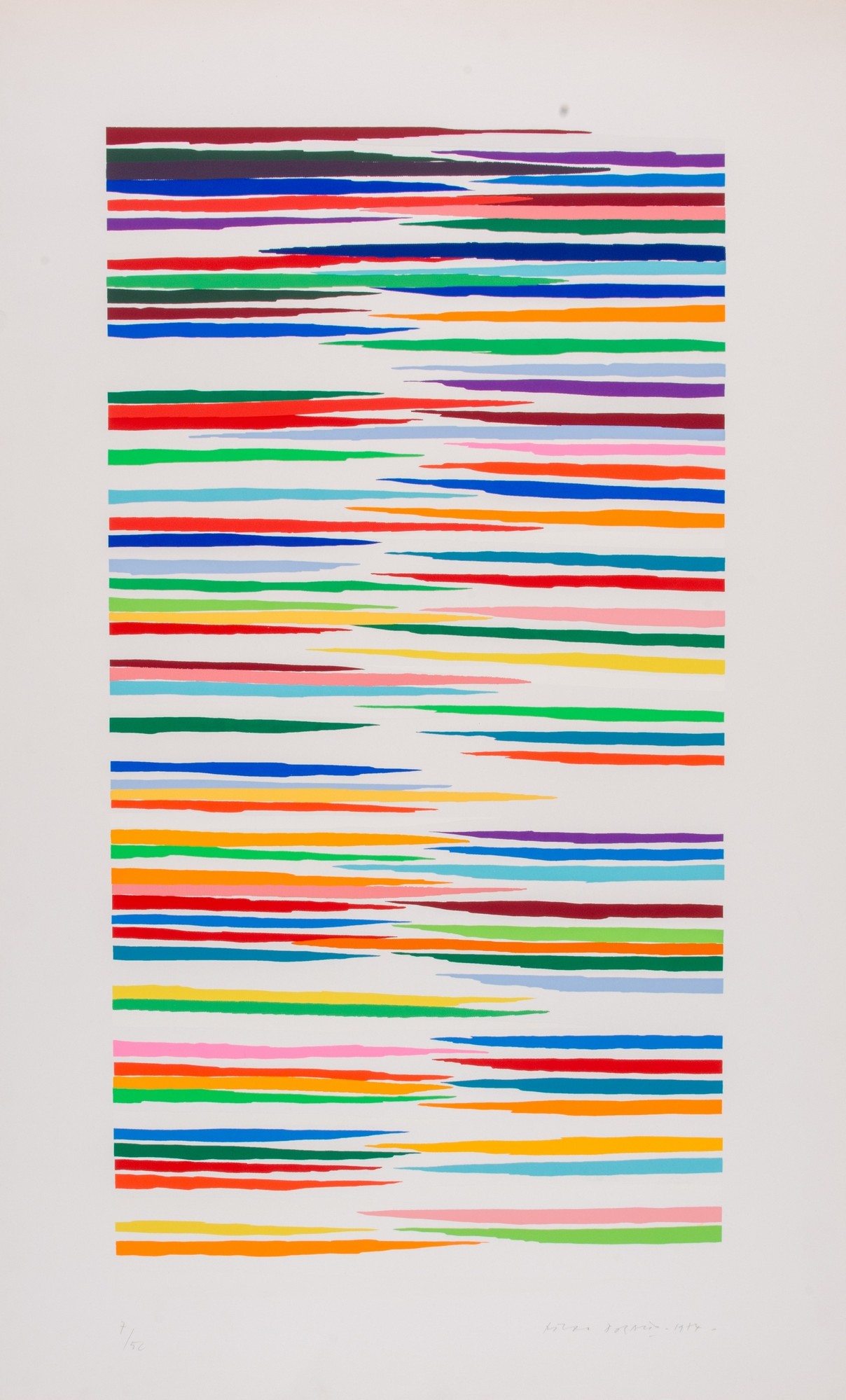 PIERO DORAZIO (Roma 1927 - Perugia 2005). “Senza titolo”, 1974. Litografia a colori su carta. Cm 97,7x59,8. Opera firmata e datata in basso a destra “Piero Dorazio 1974”. Reca numero di tiratura in basso a sinistra 7/50. Reca al retro timbro “Grafisier - Serigrafia - Artistica - Roma. Bollo di Autentica”.