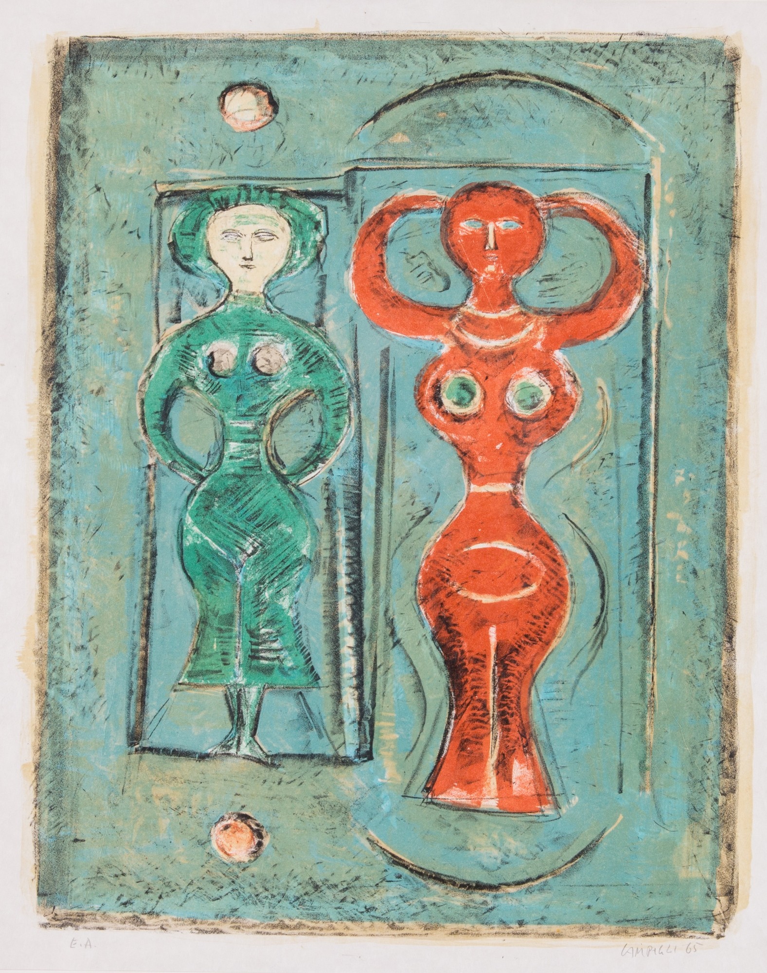 MASSIMO CAMPIGLI (Berlino 1895 - Saint-Tropez 1971). “Figure”. Litografie su carta. Lastra: Cm 53x43. Opera firmata e datata in basso a destra “Campigli ’65”, numero di tiratura in basso a sinistra “E.A”.