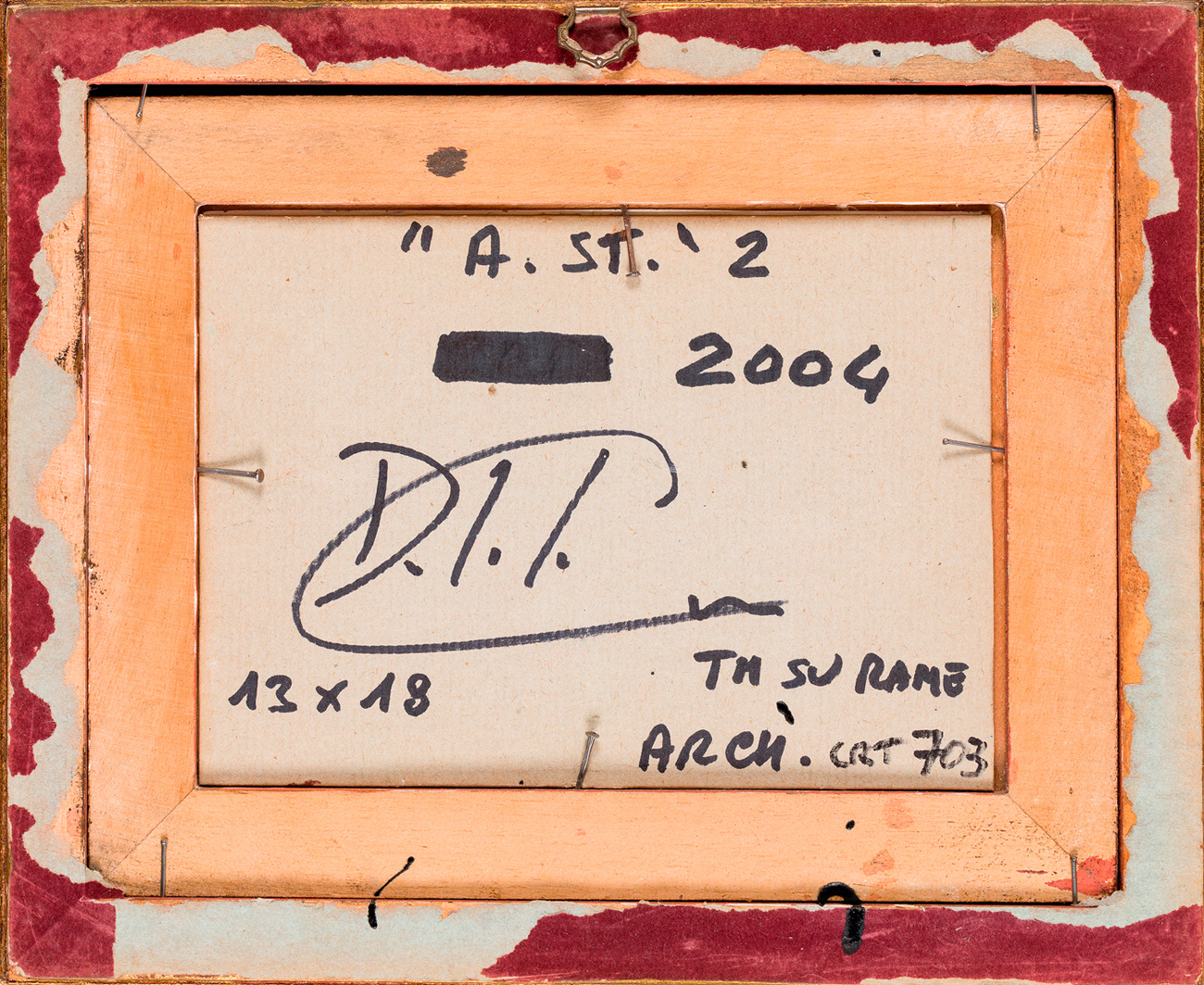 Firma, titolo, datazione, misure e numero di archiviazione al retro del cartoncino protettivo