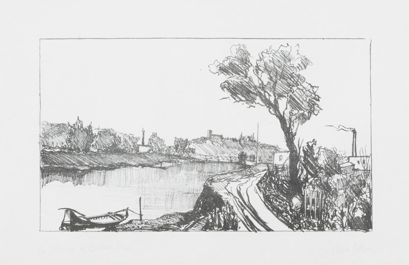 Silvio Polloni L'Arno Acquaforte di cm. 22x36, su carta di cm. 34x49 Firma in basso a destra, tiratura in basso a sinistra.