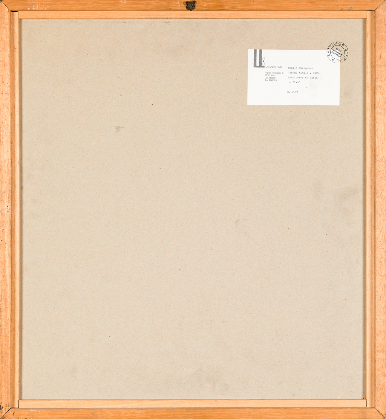 Etichetta e timbro della Galleria Arte Centro (MI) al retro del cartone protettivo