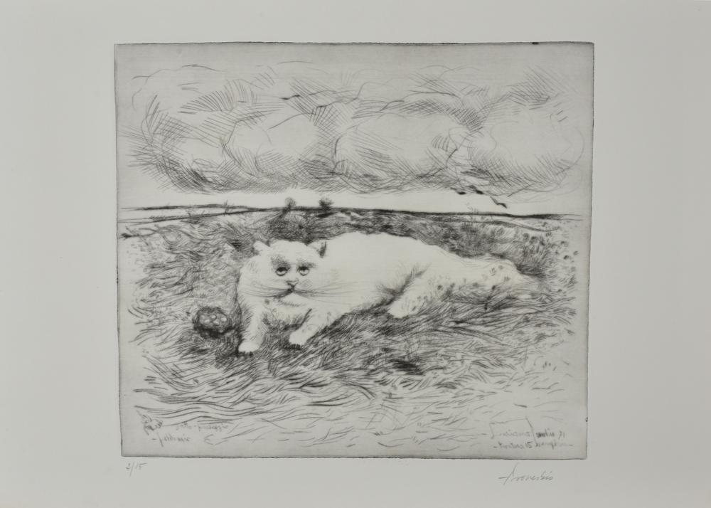 Luciano Proverbio GATTO CACCIATORE puntasecca su carta, cm 38x54 (lastra cm...