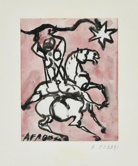Agenore Fabbri CAVALIERE acquarello su carta, cm 13,5x10,5 sul fronte: firma