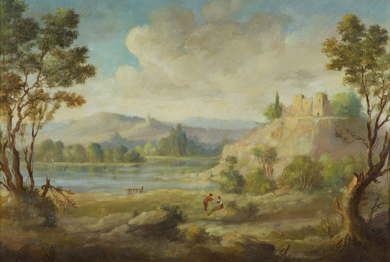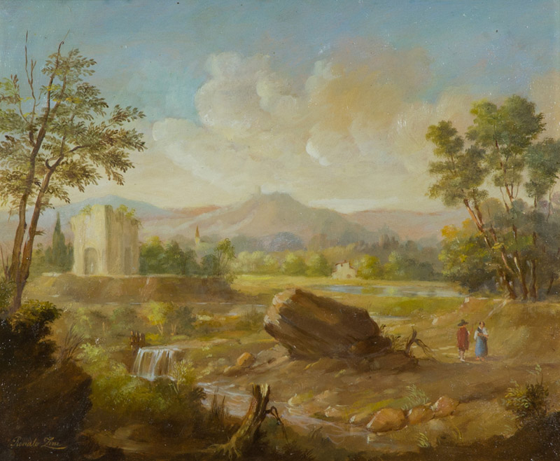 Renato Zini Lotto unico di due Opere - "Paesaggio con figure", Olio su tavola, cm. 23x32, firmato in basso a destra, sul verso: scritto di Autenticità dell'Artista; - "Paesaggio con figure", Olio su tavola, cm. 27x33, firmato in basso a sinistra, sul verso: scritto di Autenticità dell'Artista.