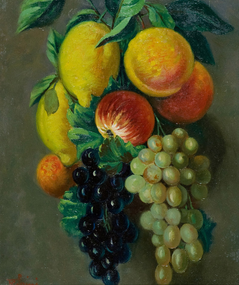 Anonimo Frutta Olio su cartone telato, cm. 45x38 Firma illeggibile in basso a sinistra.