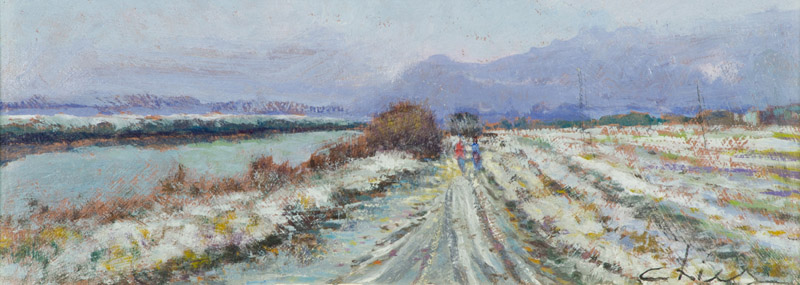 Biagio Chiesi Nevicata di Dicembre Olio su tavola, cm. 12x30 Firmato in basso a destra. Sul verso: firma e titolo.
