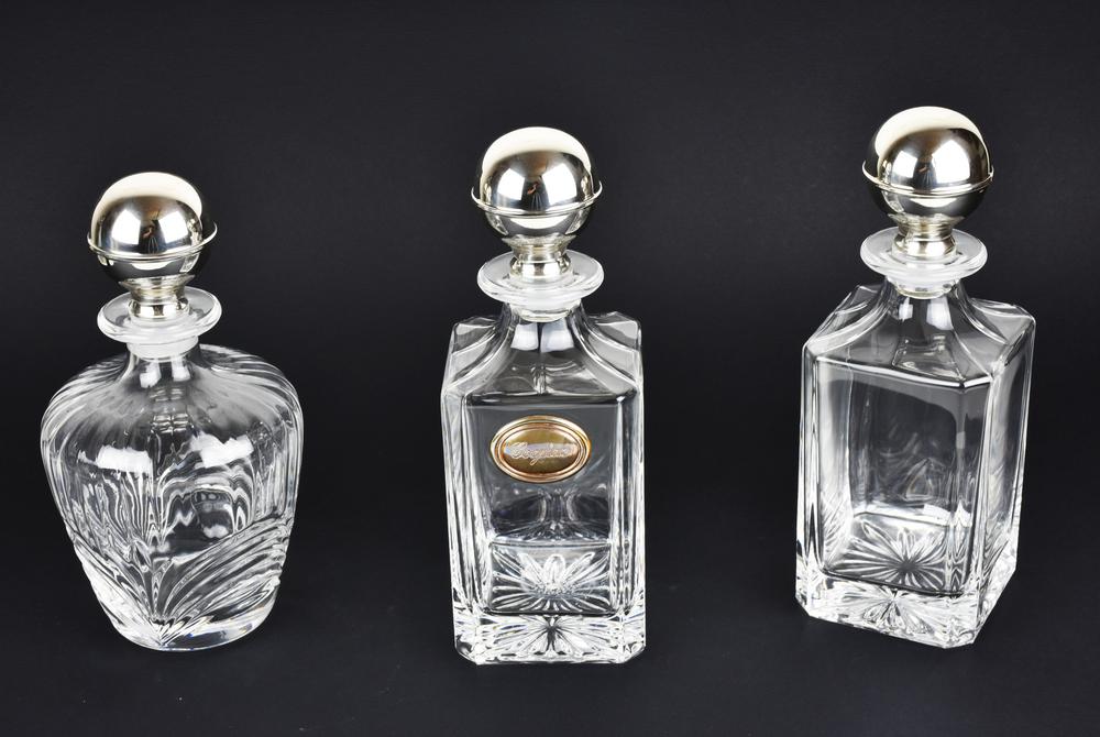 LOTTO DI 3 BOTTIGLIE IN VETRO CON TAPPO IN ARGENTO 925 h cm 24 e 26